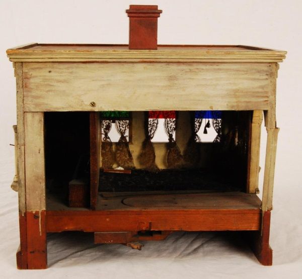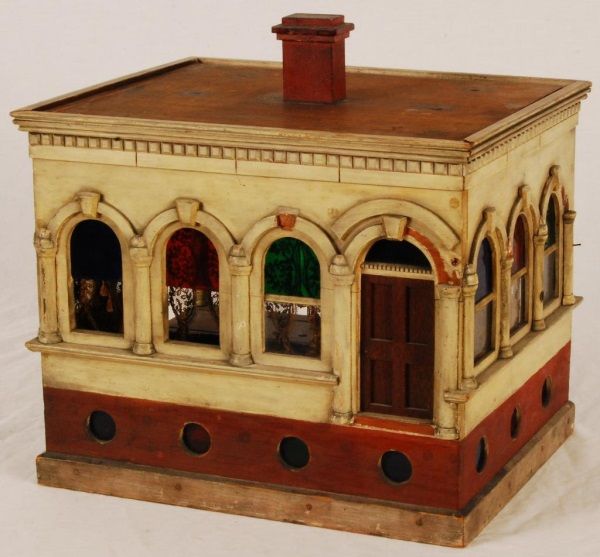Early Wooden Toy Train Depot with Stained Glass Windows. Pre-1900. Measures 13-1/2" W x 11-1/4" D x 13-3/4" H.