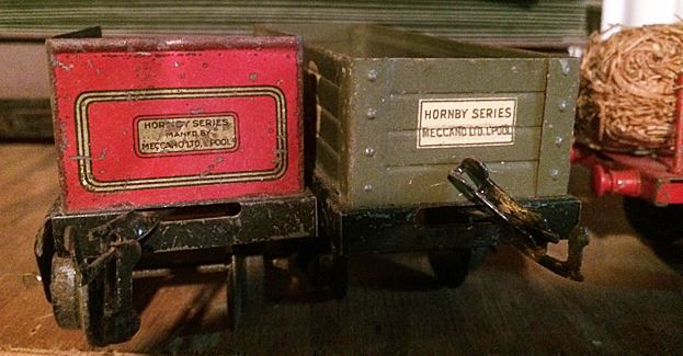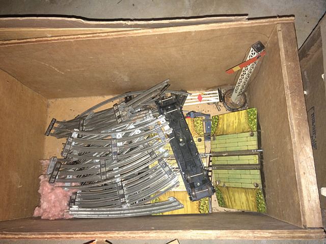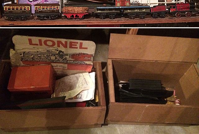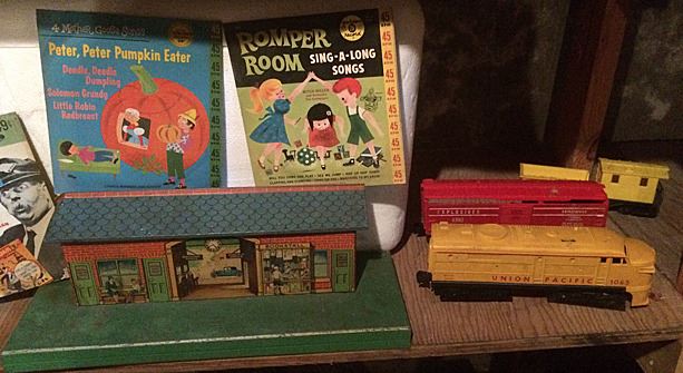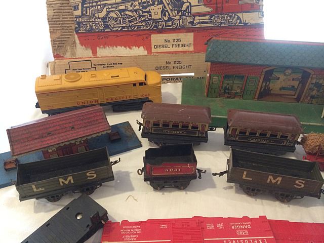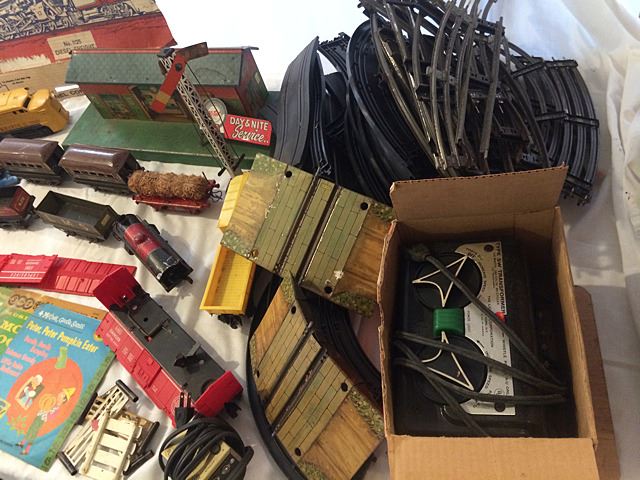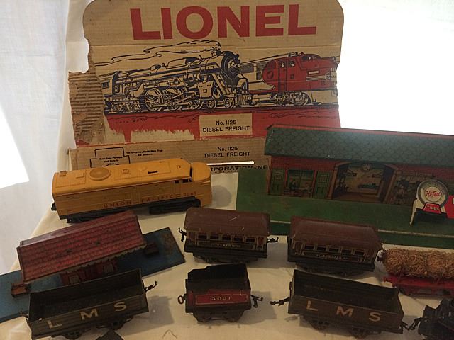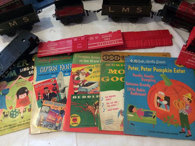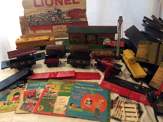 Toy trains include antique Hornby Series rail cars and train set buildings, Lionel trains and tracks, transformer, accessories, plus children's 45 vinyl records.