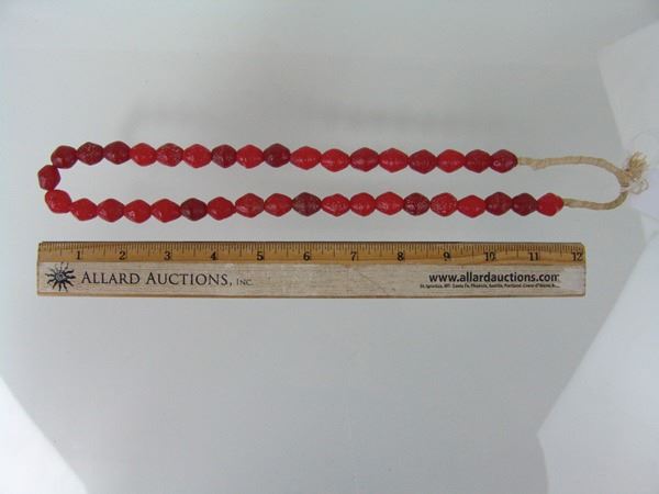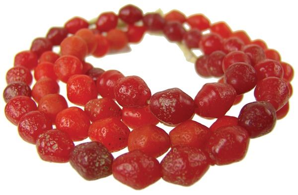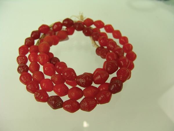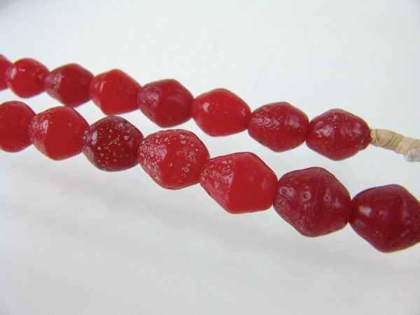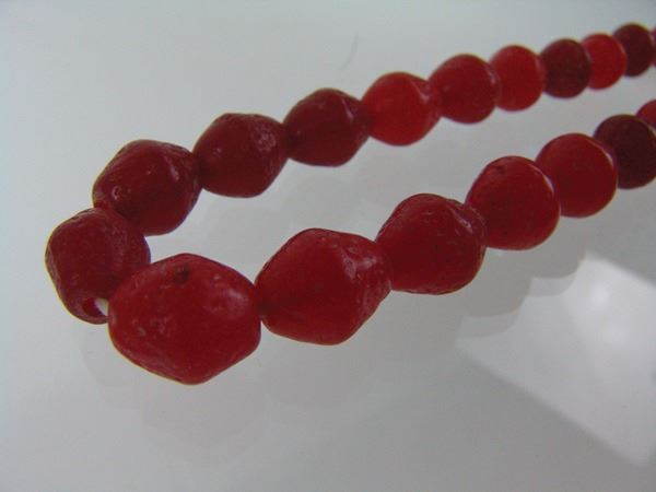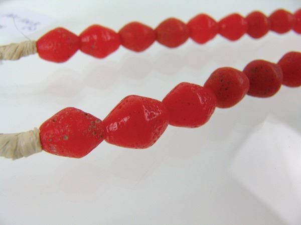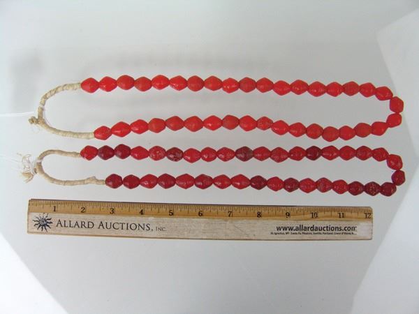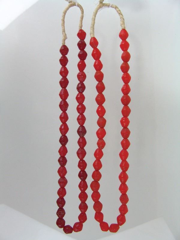 Early 1900s 27" Two strands of molded Venetian glass biconical beads in rare, red and orange colors. These are the ones that have the natural, rough finish. Very good condition,