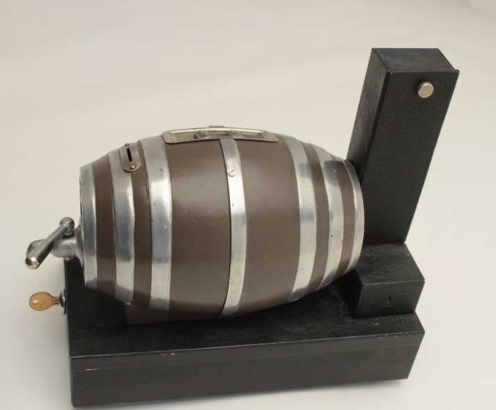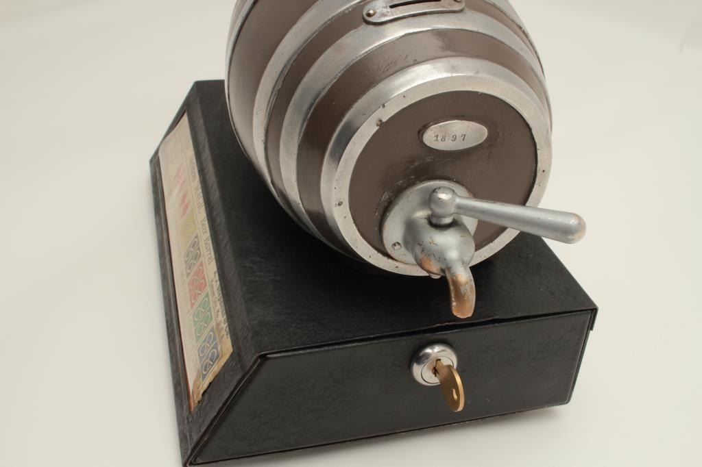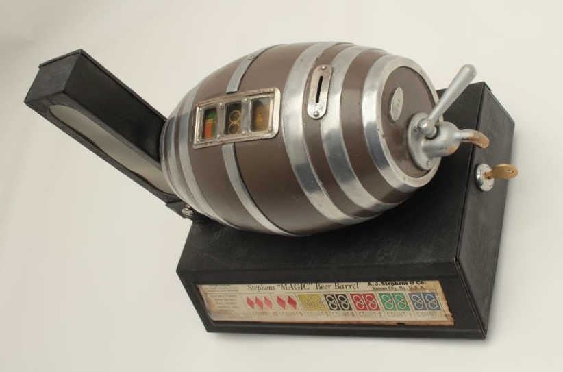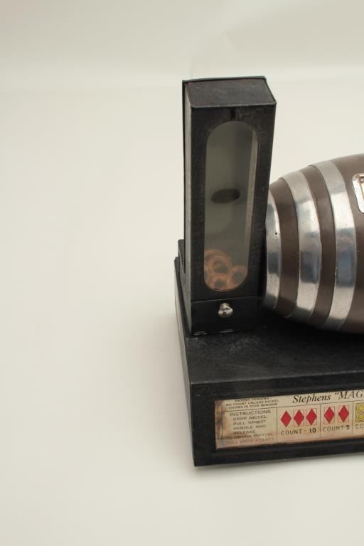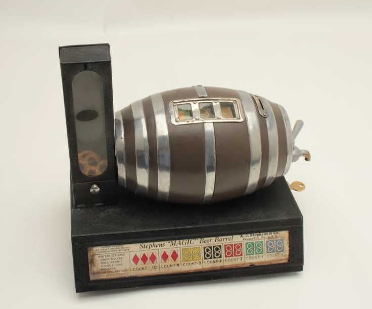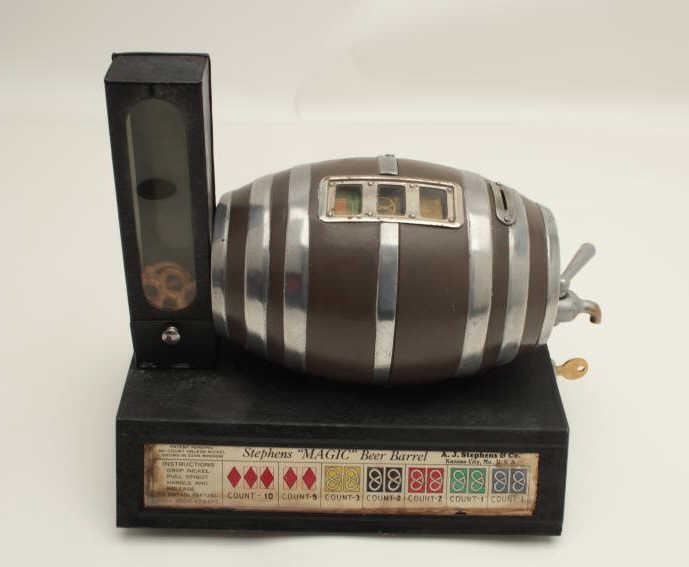 Antique Trade stimulator entitled “Magic” Beer Barrel, by A.J. Stephens & Co., Kansas City, MO., U.S.A.; approximately 12” in height, 12” wide and 8” deep; in very good to near fine condition with key and working attime of description. Est.: $1,000-$2,000.