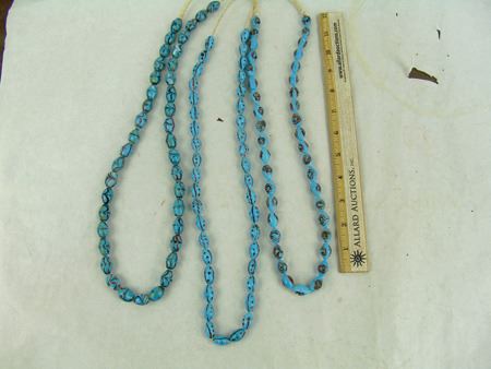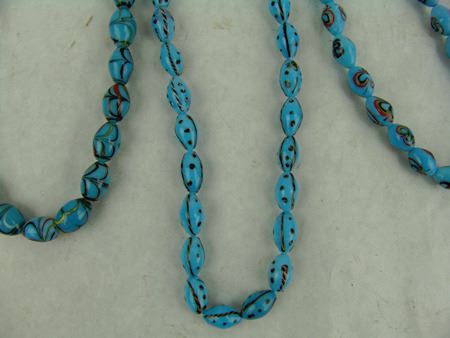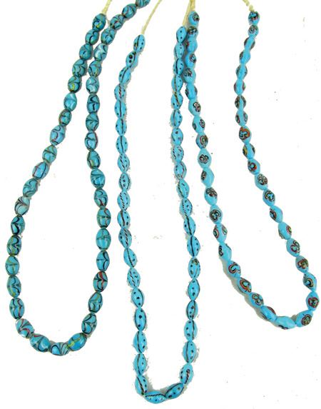Early/Mid 1900s, Three strands of colorful blue infused Venetian glass pointed tradebeads traded via India in the 1950s. Very good condition. Ex. John Gogol Collection. 30" each
