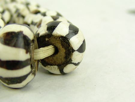 Mid 1900s, Three different types of hand carved African bone batik beads, each with a hand carved wooden insert. Very good condition. 24" each