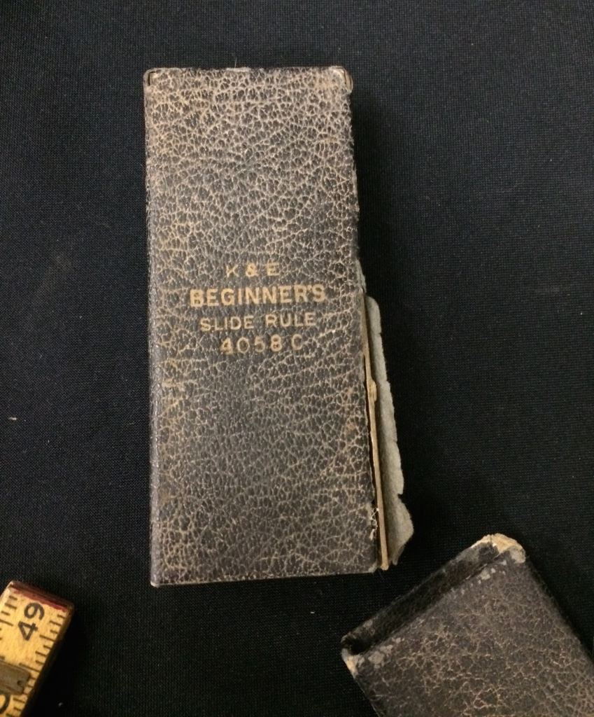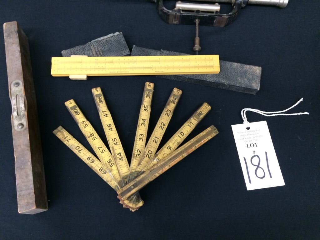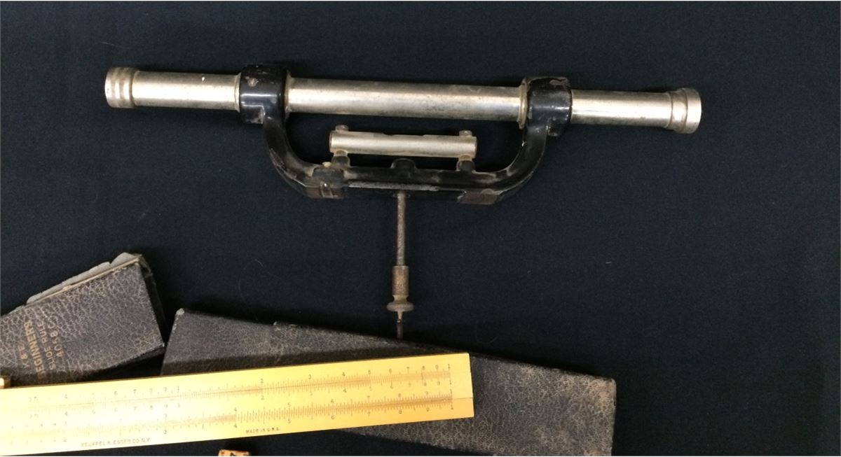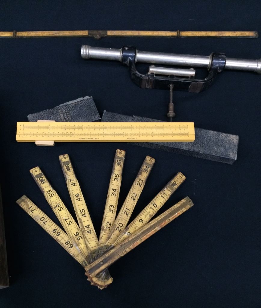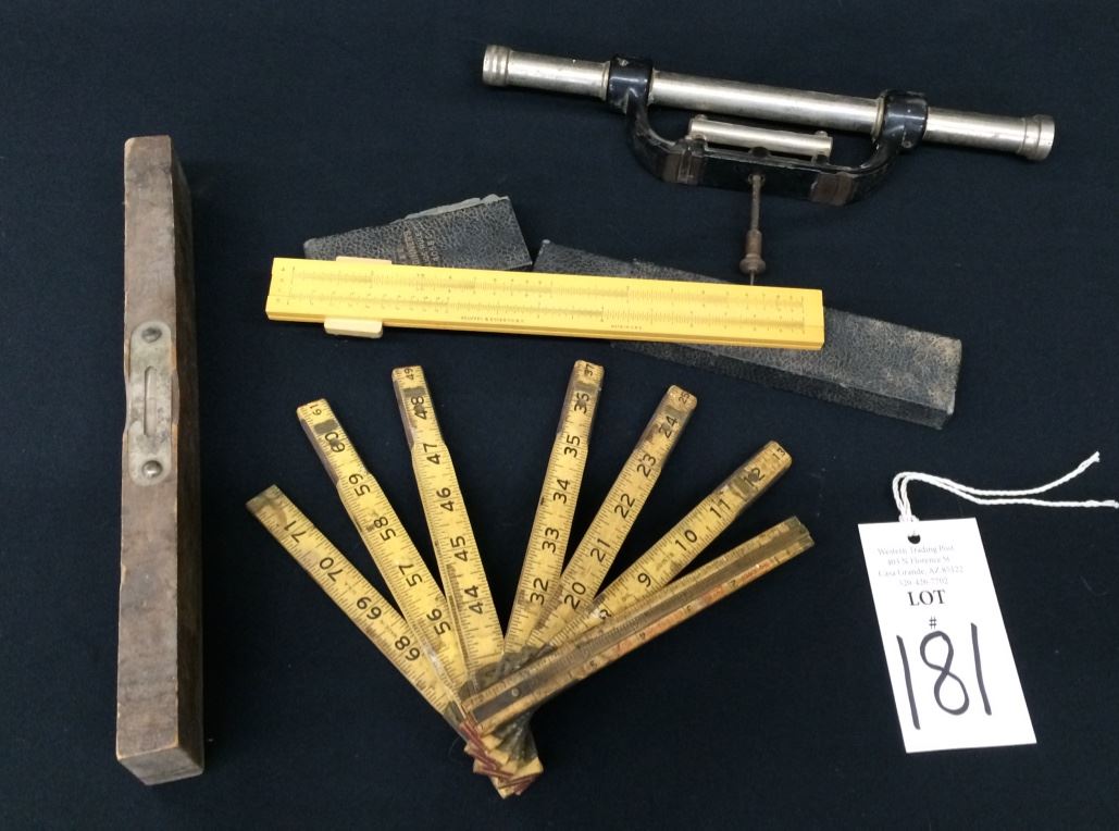 You get 4 different pieces for one money in this lot! There is an antique transit, an antique level, a very old fold out ruler and a slide rule in its original box. Please look closely at pics to see what you will get.