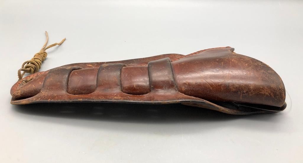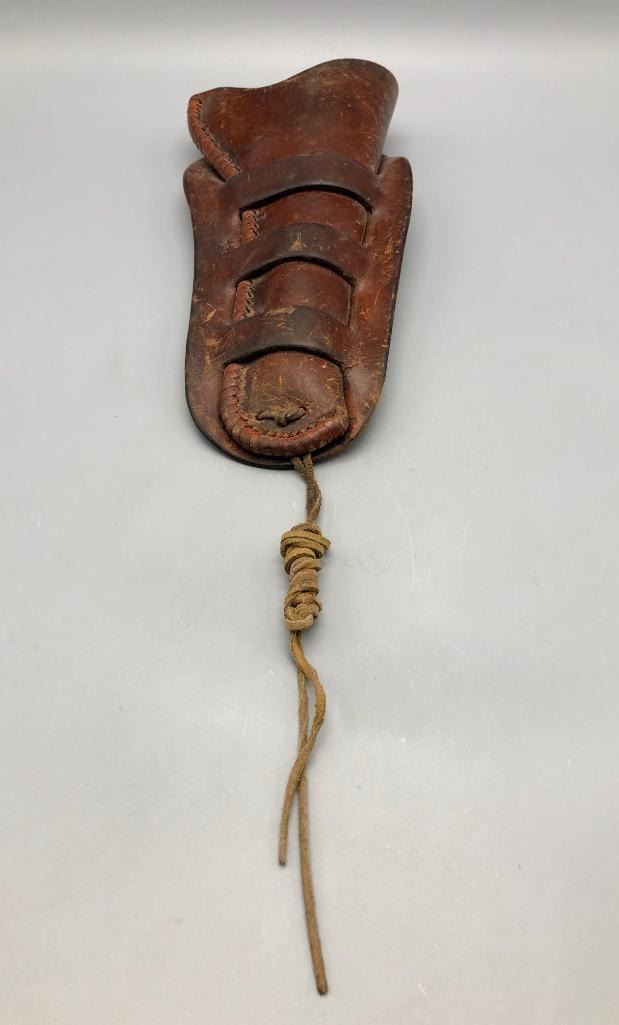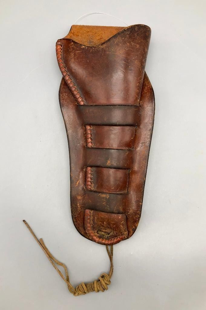 Presented for sale in this lot is an older triple loop holster in good condition. It is unmarked, but well made. MAKER: Unmarked. APPROX AGE: Circa early to mid 1900s. SIZE: 5-3/8 inches wide x 12-3/8 inches long. CONDITION: Good for its age, normal wear expected. Please look closely at the pictures as they are an important part of our description and are hereby incorporated into the description, specifically with regards to condition. SHIPPING: There will be a $5 handling / packaging fee for shipping this lot. The actual cost of postage will be added on top of that. BUY IT NOW: If you would like to buy this item now, without waiting for the auction day to bid on it, we do offer this option (which is available up to 48 hours before the actual auction starts). The “Buy it Now†price is the high estimate of this lot (plus applicable fees and the Buyer's premium is discounted to 10% when using the Buy it Now option). If you would like to exercise this option, you must contact us by email (or phone as long as you talk to someone live). Reference this lot number and your intention to "Buy it Now."