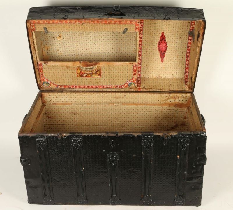 Domed trunk that has been painted black with a floral and cross motif. Leather handles with original paper and decals in interior that are peeling. Made by "Adams Express Co. Cincinnati, O." Measures 24"h x 34"l x 18"w.