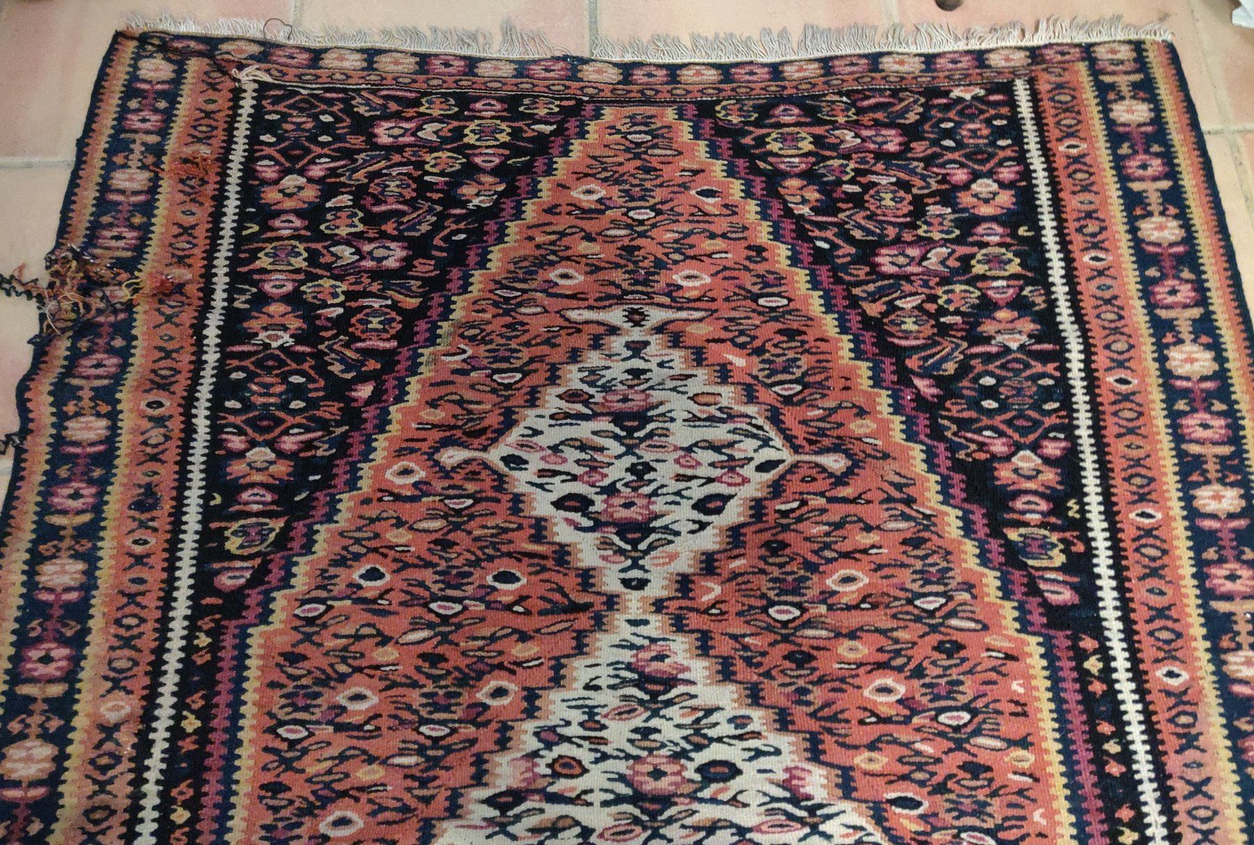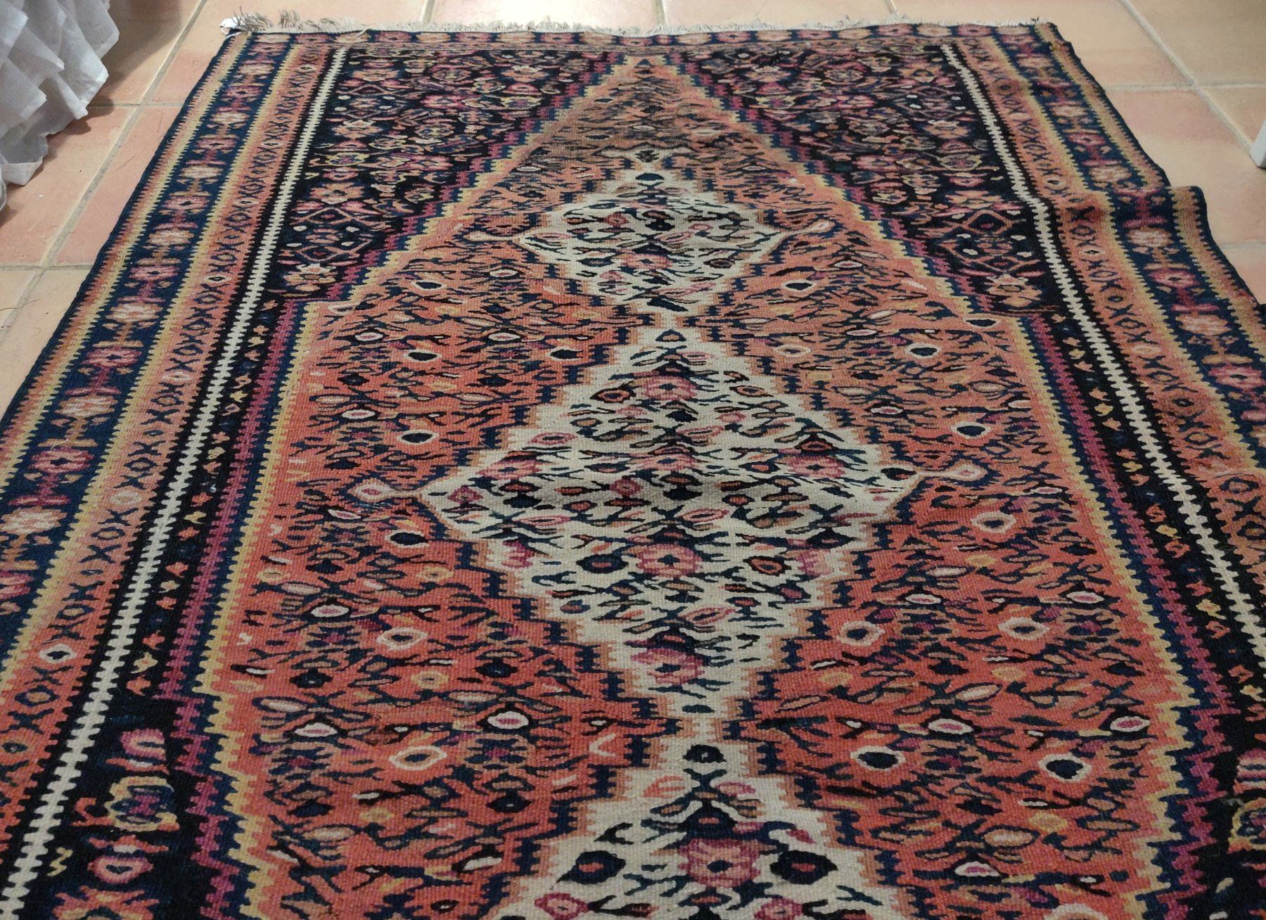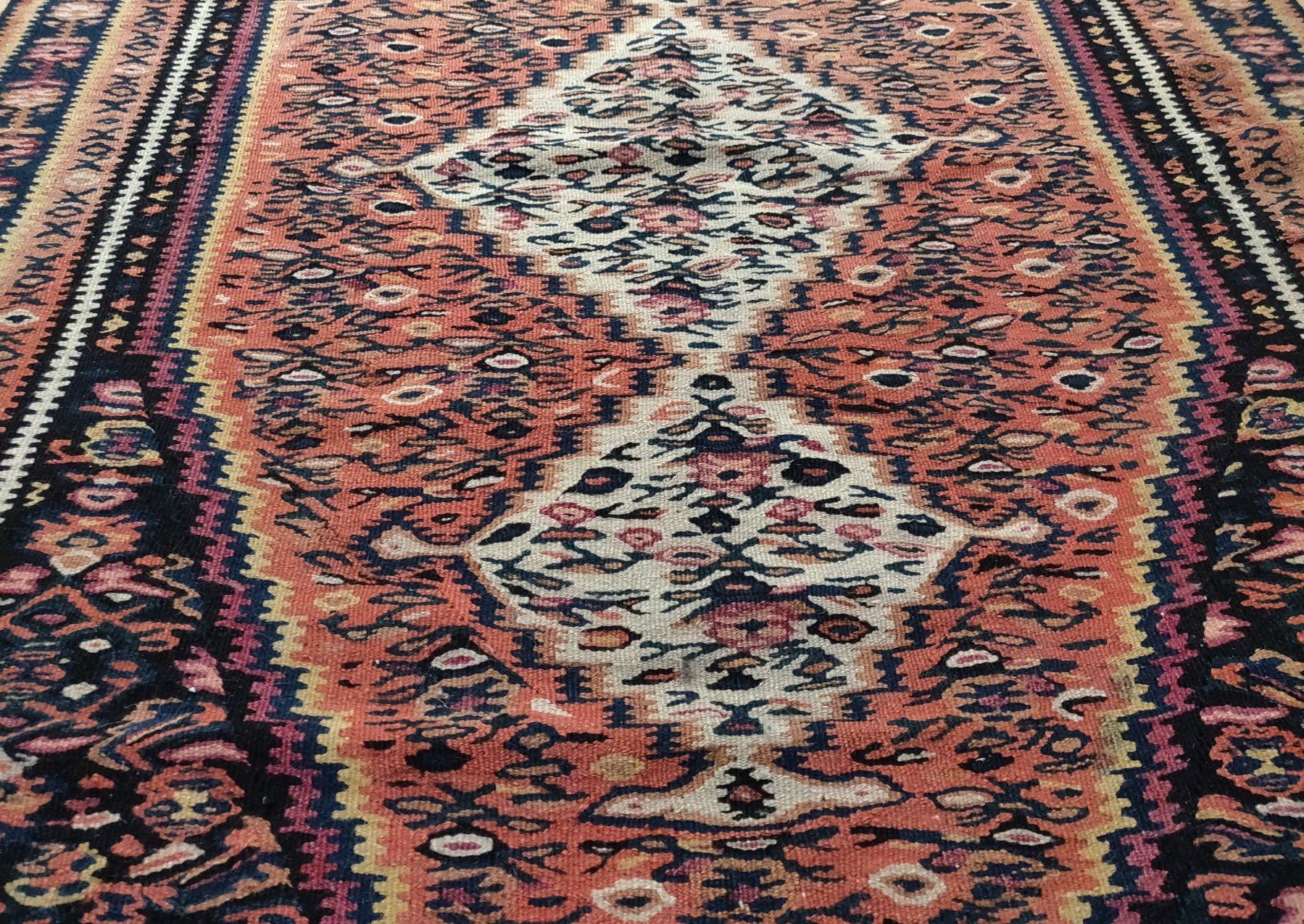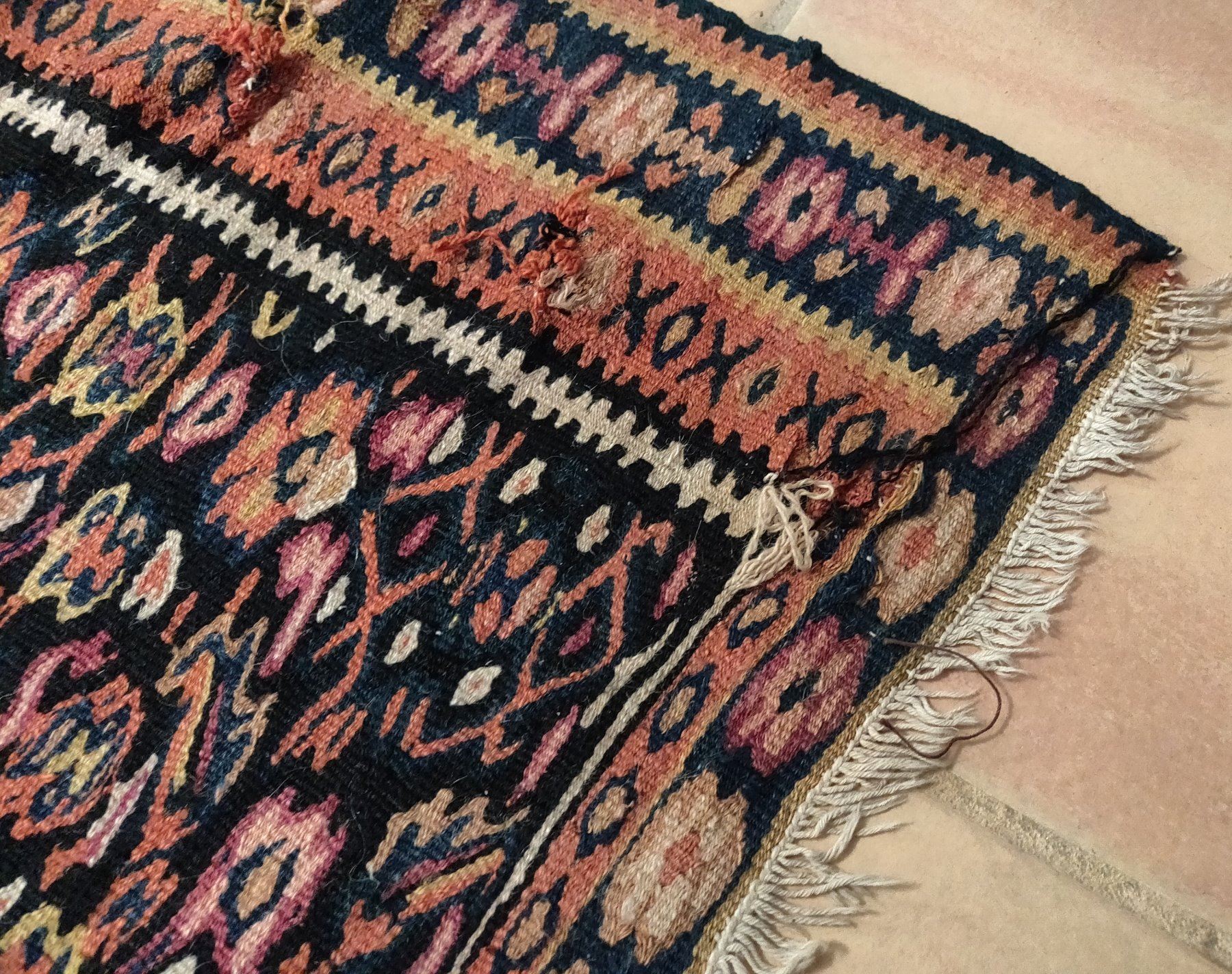 Antique Turkish Weaving, c. 1940s. Made of wool, the item measures 61" x 42" wide. Turkey. Nice colors and pattern on this lightweight rug. Condition: Some wear, see images. Shipping: $40.00 USA estimate only, w/insurance and signature, due to size, weight and value.