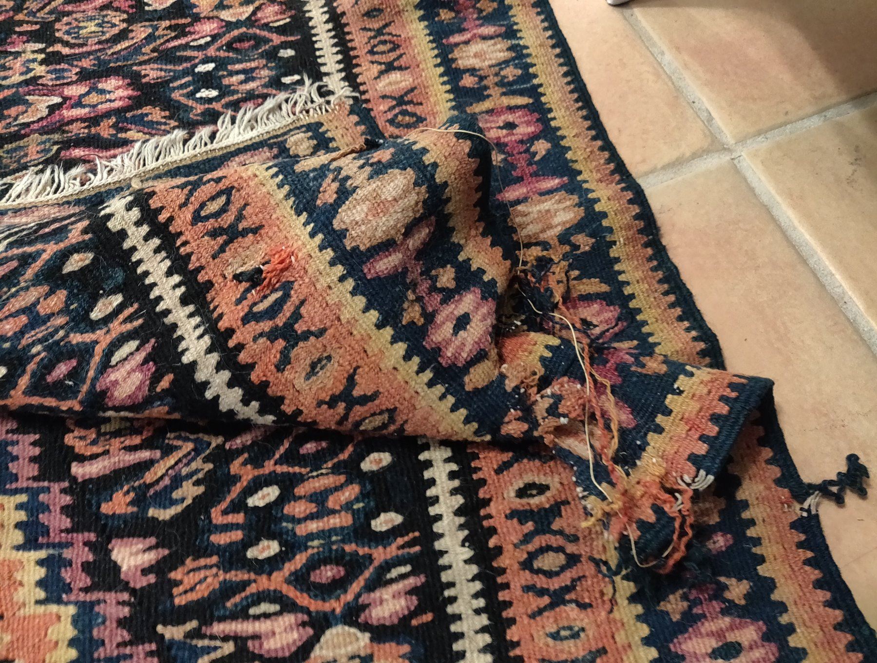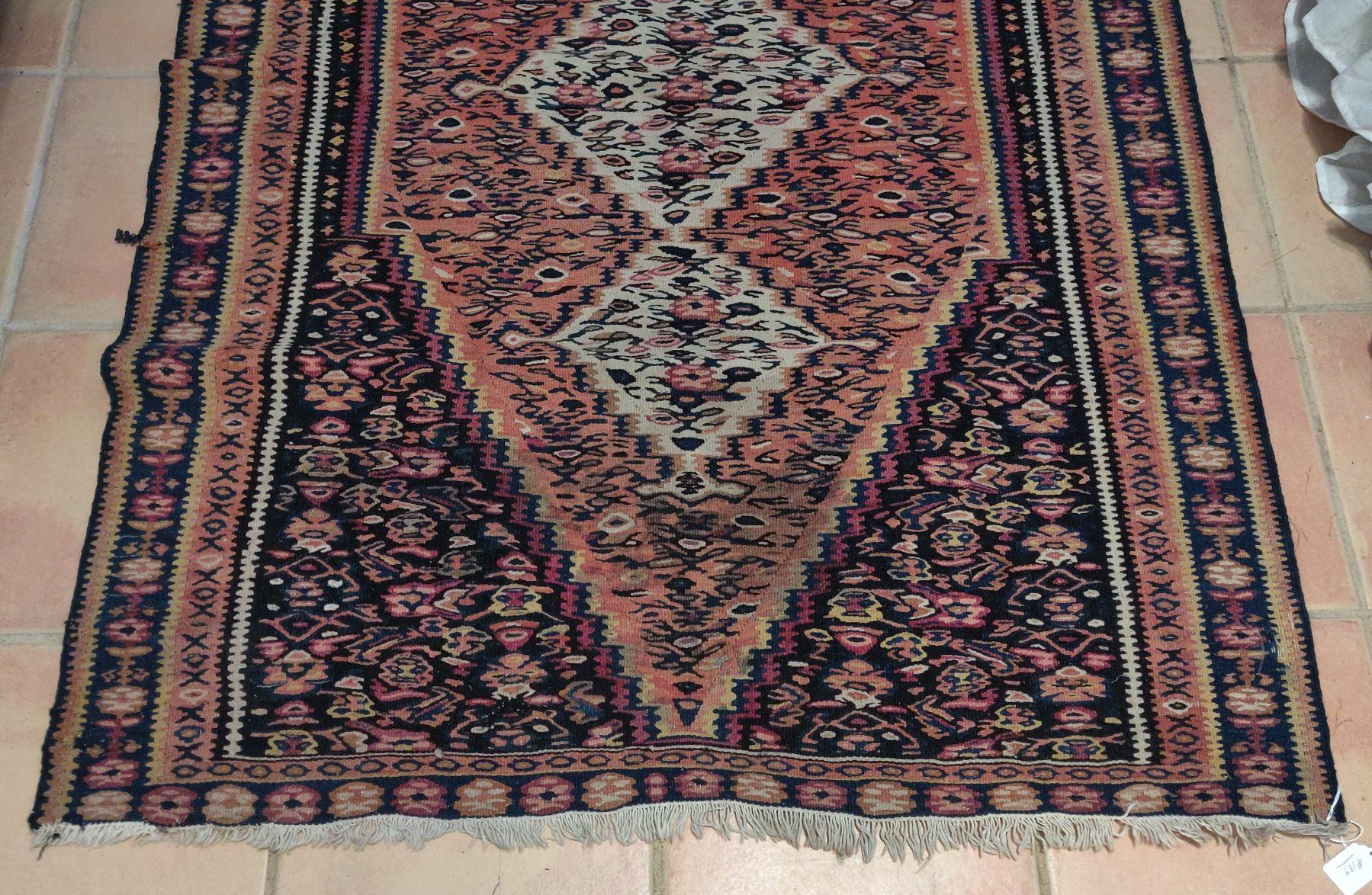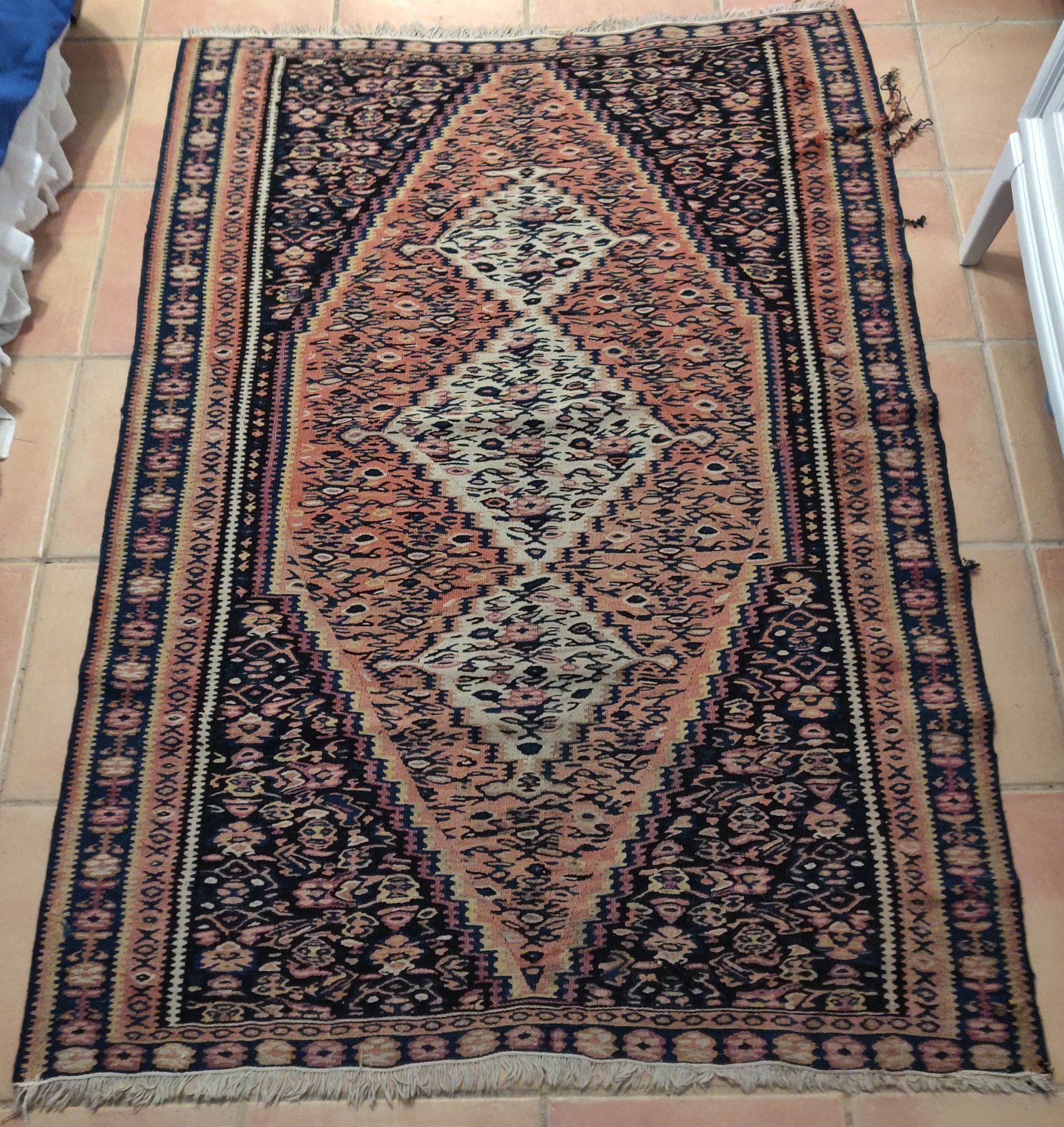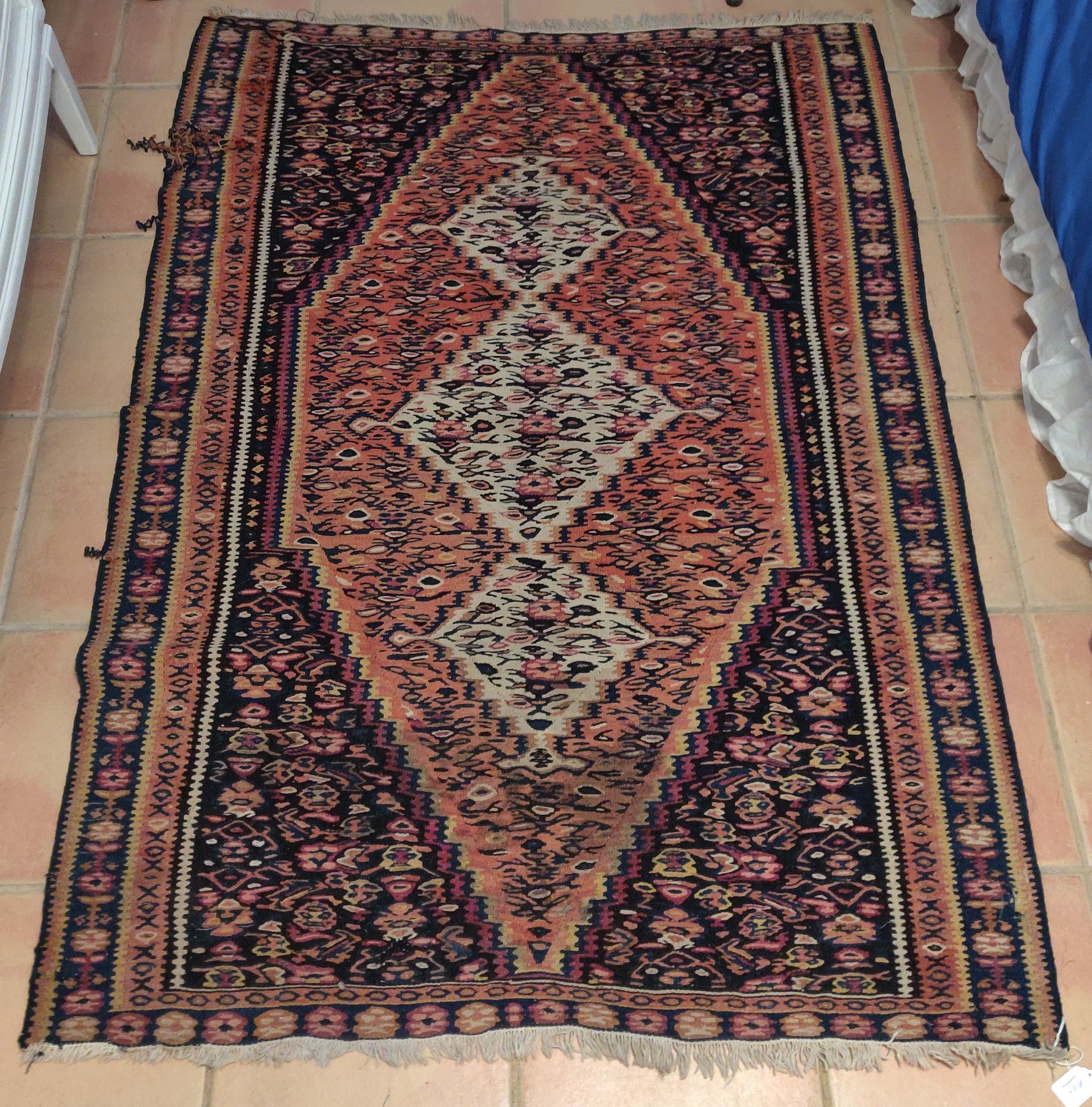 Antique Turkish Weaving, c. 1940s. Made of wool, the item measures 61" x 42" wide. Turkey. Nice colors and pattern on this lightweight rug. Condition: Some wear, see images. Shipping: $40.00 USA estimate only, w/insurance and signature, due to size, weight and value.