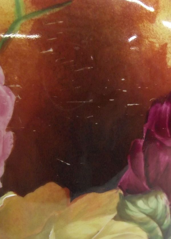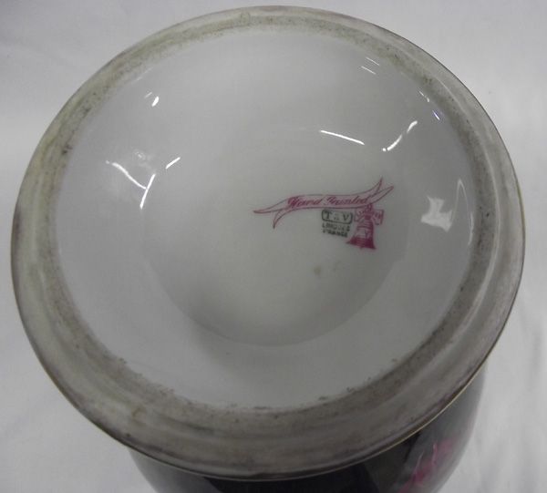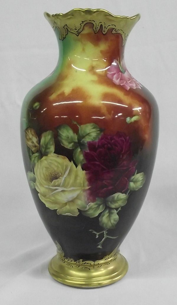 Antique Turn of the Century T&V Limoges Gold Gilt Vase. This is a gorgeous hand painted Limoges vase with gold gilt around the base and the rim. Roses surround the body of the vase. It is signed by the artist, Rousset (a Limoges artist) in a leaf on the lower third of the vase (see photograph). It measures 15''H x 5''W at base x 7.5''W at widest diameter. It has some normal wear for age; there are some very fine lines of wear on the shoulder of one side, as shown in the photographs. The gold gilt and overall finish is in good condition. The large vase was molded. The vase was brought from New York to New Mexico at the turn of the century by Dr. Herbert Boyd Matsen. Matsen had come to Albuquerque in the late 1890s. When his wife died in 1902, he purchased the Dorsey mansion outside of Chico Springs, N.M. It was a Gothic Victorian palace built by the infamous and controversial carpetbagging U S Senator from Arkansas, Stephen W. Dorsey. Matsen turned it into a sanitorium, the ''Chico Springs Sanitorium Company.'' The vase was inheirited by the current owner. A partial printed copy of the booklet, ''Rogue!'' is included. The booklet discusses the history of the Dorsey mansion including the acquistion of it by Dr. Matsen. There are also a few pages of information printed out from the current owner's website and from Wikipedia. According to the website: http://e-limoges.com/makers/tressemanes-vogt-limoges.php, the marks on the bottom of this vase indicate it was made between 1892-1919. Gustave Vogt (1849-1937) took over the Limoges branch by 1870 and partnered with Emilien Tressemanes in the early 1880's. In 1891 they bought two small porcelain factories in Faubourg Montjovis (Limoges) and made high quality whiteware for export to the USA. The company was commissioned in 1891 to produce a dinner service for President Harrison. Tressemann retired in 1907 and Gustave Vogt became sole owner and changed the name to Porcelaine Gustave Vogt. In 1919 Martial Reynaud bought the company and continued using the T&V mark as well as his own Reynaud mark. Reynaud porcelain remains in business today. There is also a purple decoration mark banner with ''Hand Painted'' plus the bell. The green porcelain mark of T & V in a rectangle with ''Limoges France'' beneath it dates from 1892-1907. It is the Tressemann and Vogt Limoges France Mark 10.