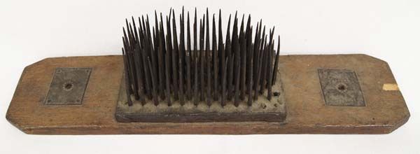 Wool Carder, measures 18"L x 4"W, mounted on wood, Antique flax wool farm tool for carding/spinning work. There is a hole on each end to help anchor it and keep it from moving while being worked.