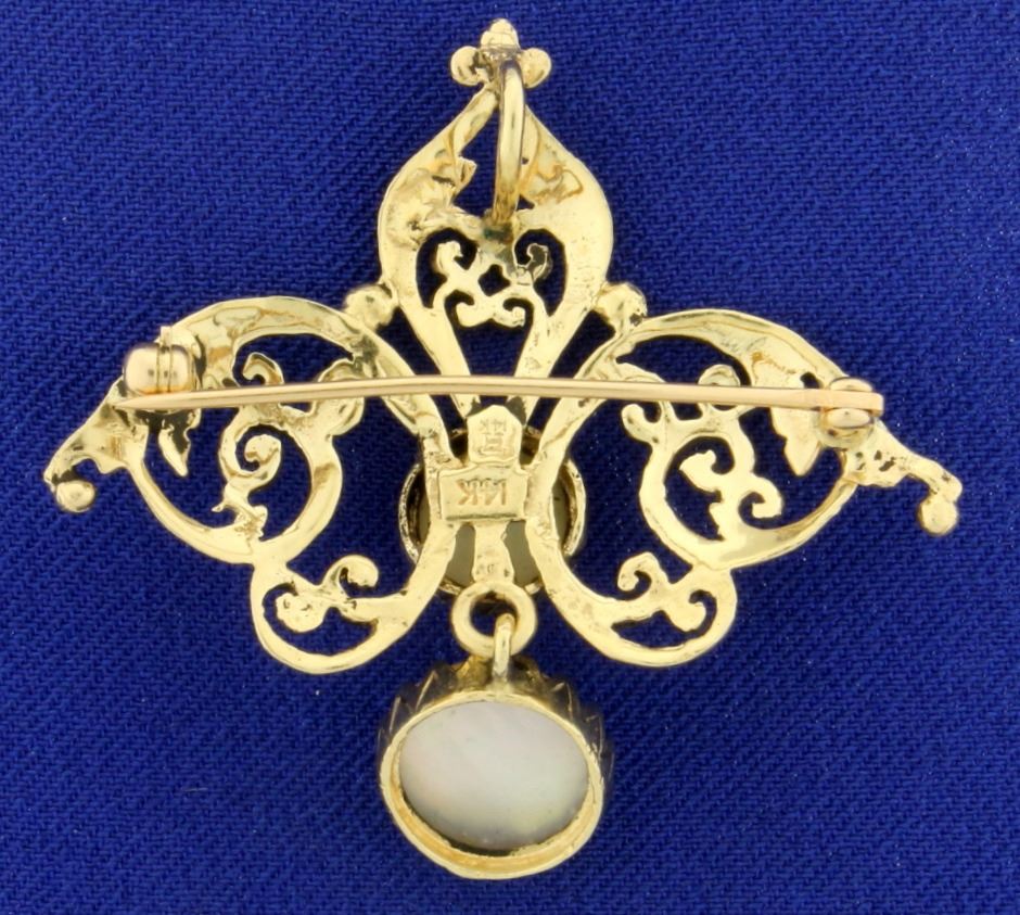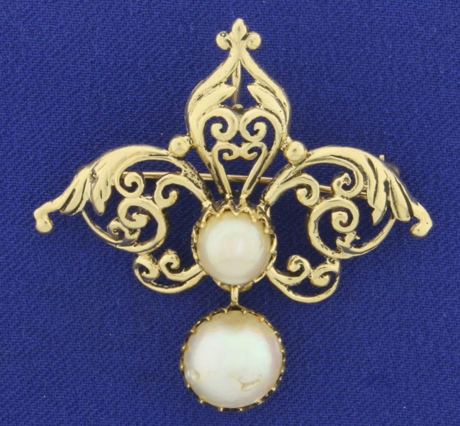 In 14K Yellow Gold. Contains an 8mm and a 10mm Pearl with great creamy color. Two imperfections on bottom pearl, indicative of age. 1 3/4" long with bale. 8.1g
