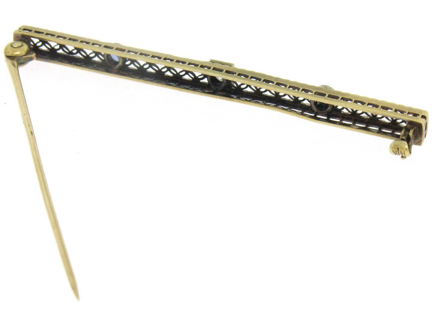 Antique Two Tone 14k Gold Diamond & Synthetic Sapphire Open Filigree Bar Pin