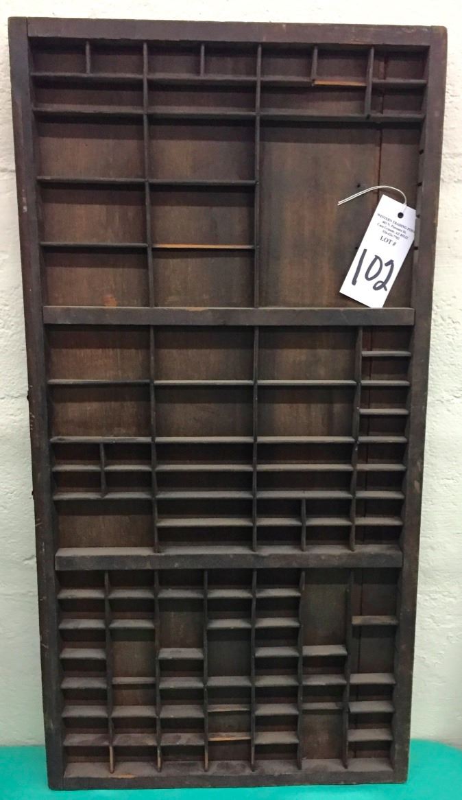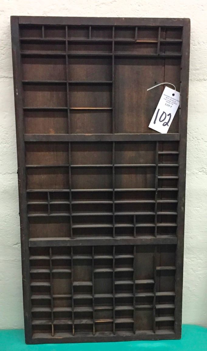 This antique type setters drawer measures 16.5" x 32.5" and is 1.5” deep. Mostly original condition. Has been modified to hang as a display rack. Please look closely at the pics as they are an important part of our description. Shipping: There will be a $10 handling / packaging fee for shipping this lot. The actual cost of postage will be added on top of that.