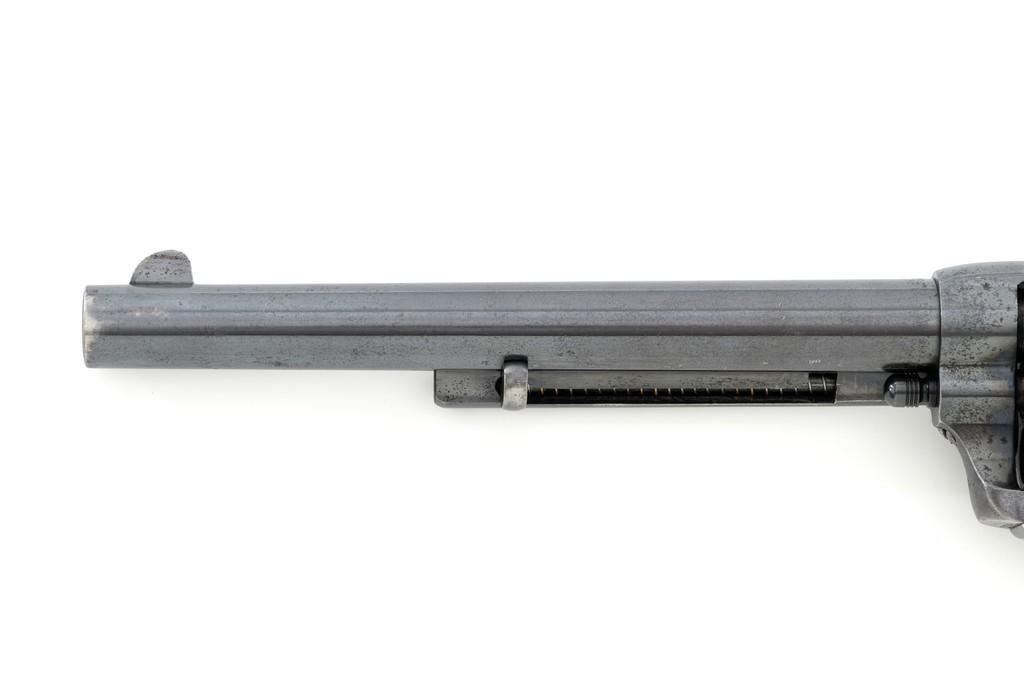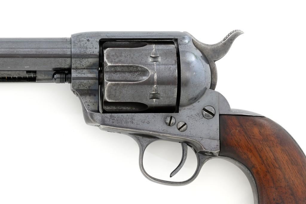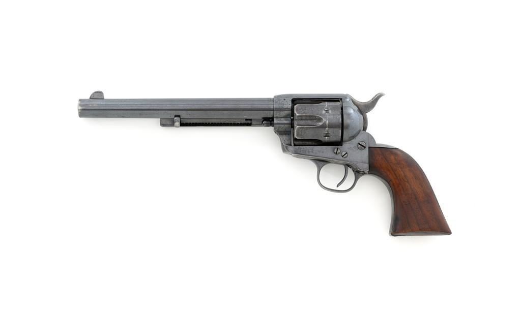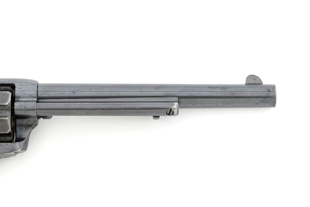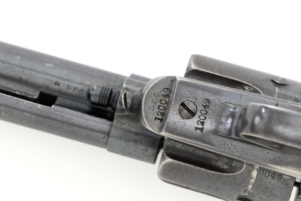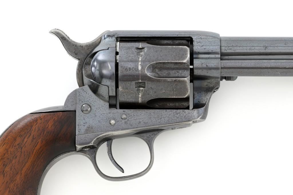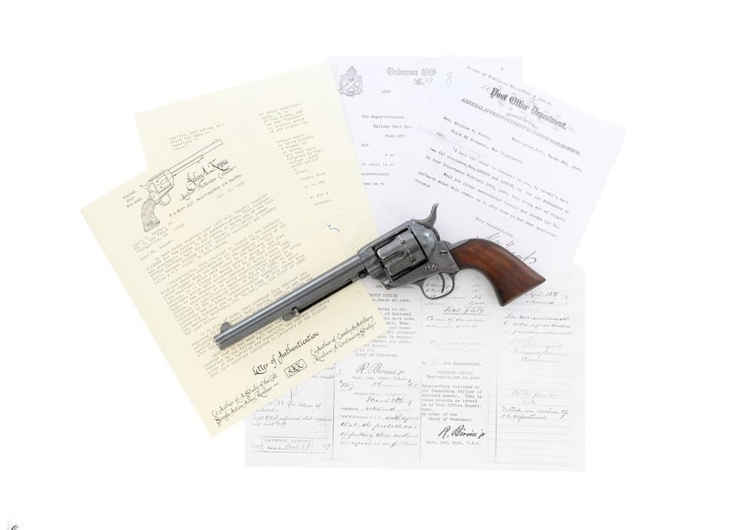 Antique U.S. Colt Single Action Army Cavalry Revolver Issued to U.S. Post Office Department, with Kopec Letter, #120049, .45 Colt cal., 7.5'' barrel, full blue ''arsenal refinish", smooth walnut grips, blade front and fixed ''V''-notch rear sight. All matching numbers located on the frame, barrel, cylinder, trigger guard, and backstrap. Lower left side of the frame is marked ''U.S''. ''D.F.C.'' inspector's marks can be found on the bottom of the frame, rear bottom of the barrel, and rear round of the cylinder. Underside of the barrel and rear round of the cylinder also with a small ''P''; small ''G'' in the frame's hammer well. Assembly number ''37'' is stamped inside the loading gate. No inspector cartouche is visible on either grip panel. Mfg'd circa 1887. Revolver is in fine condition, retaining approx. 85% Ordnance Dept. refinish, showing general thinning and toning. Front and backstrap have worn to primarily gray, with darker toning to the hammer. Grips have been sanded and are now relatively smooth, showing intermittent light handling marks, few areas of darkening along the edges, and moderate shrinkage. Action is crisp, cycles smoothly, but is missing the second click and the cylinder will not turn freely. Bore is bright with defined rifling. This desirable Colt is accompanied by several documents, including a 1996 dated John A. Kopec letter, indicating in summary that this revolver was returned to the Chief of Ordnance, War Dept. by the Post Office Dept. as ''unserviceable'', was refurbished by the War Dept. but not as an artillery model and retained its 7-1/2'' barrel, which was not common. Also, noted by Kopec is in his opinion the revolver retains its ''arsenal refinish'' that was applied after the Railway Mail Service returned it, grips have been sanded, lower forward portion of the grip strap with a laterally drilled hole, and the base pin being a later replacement. There are also copies of additional written communications between the two Departments relative to policies & procedures to resolving the repair/return of the gun. In closing, Kopec's letter is complimentary of the work done on this ''historically correct'' SAA revolver. Overall, an interesting revolver, with accompanying documentation. Est.: $5,000-$7,000. (Antique)