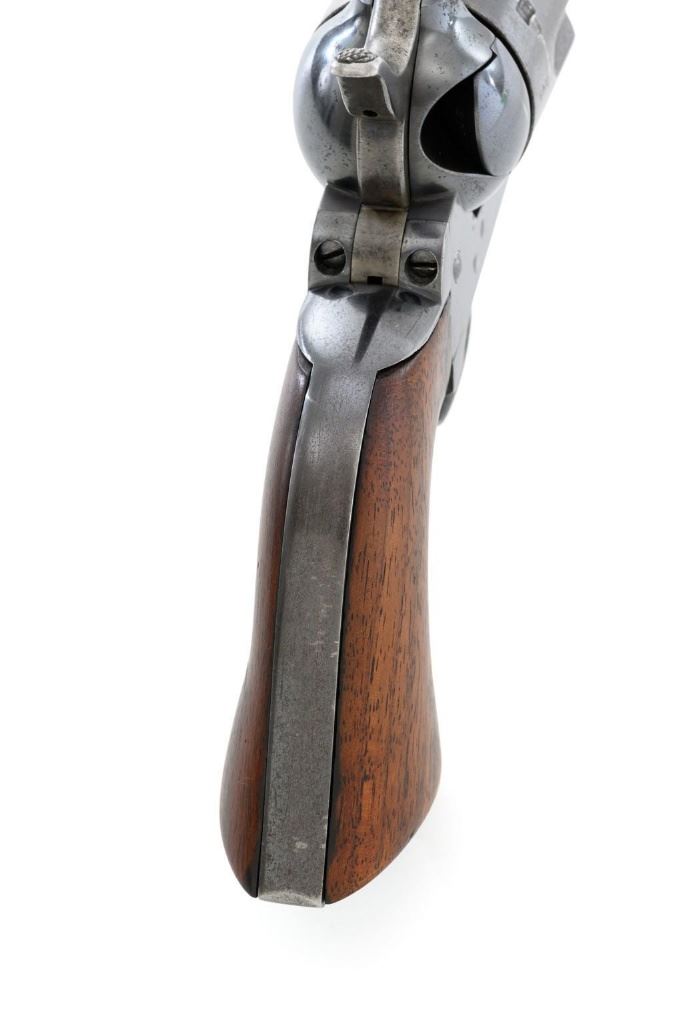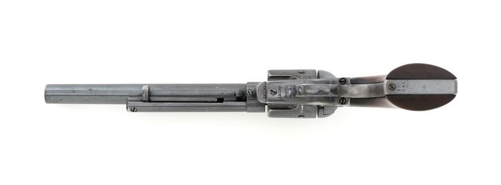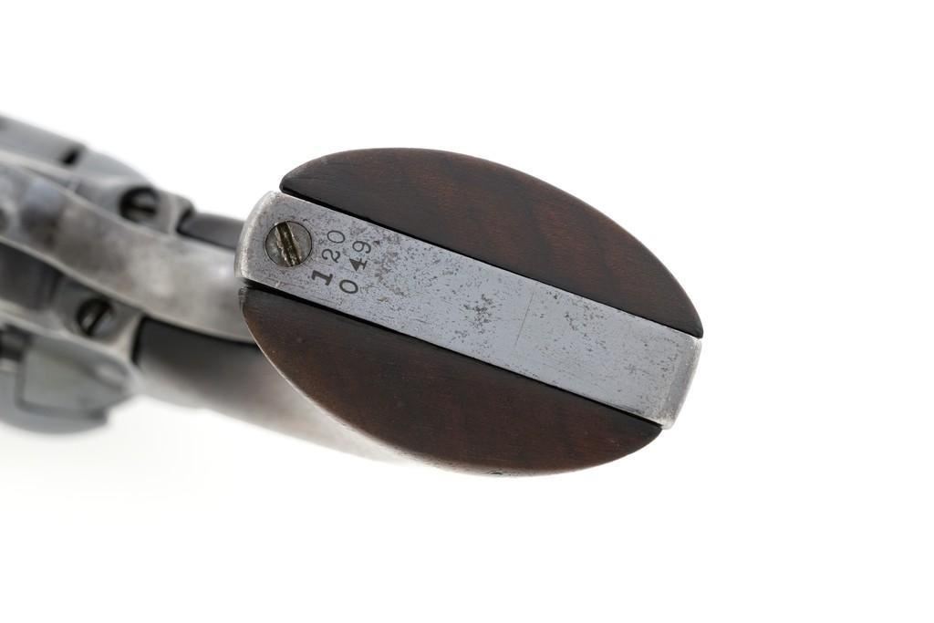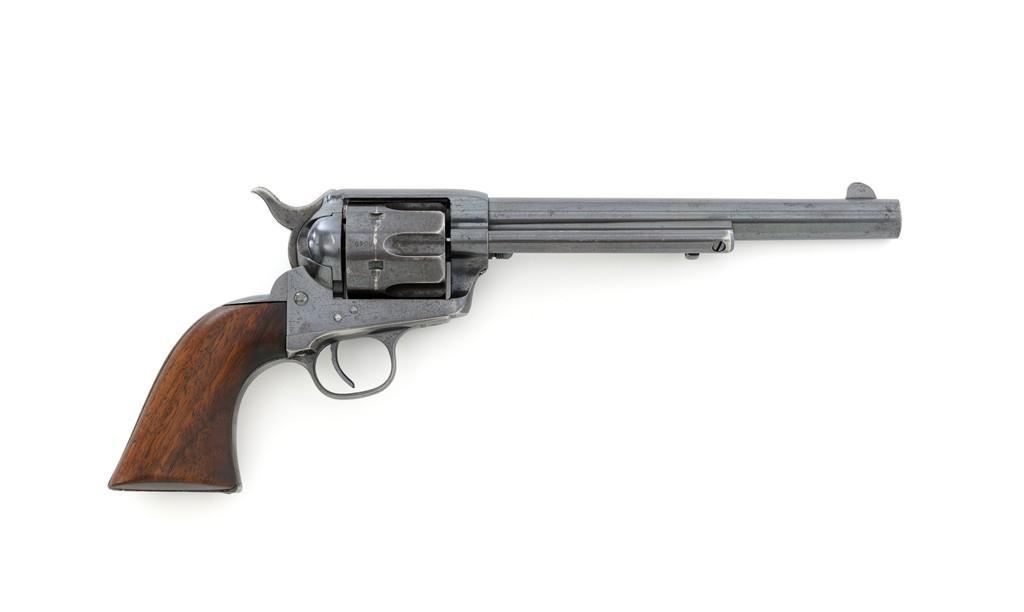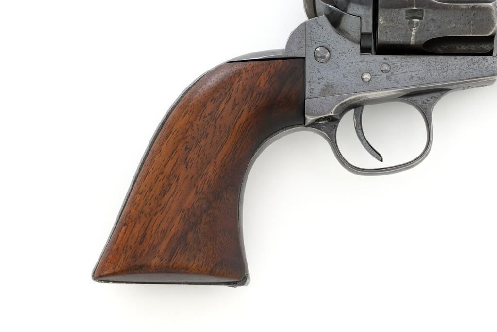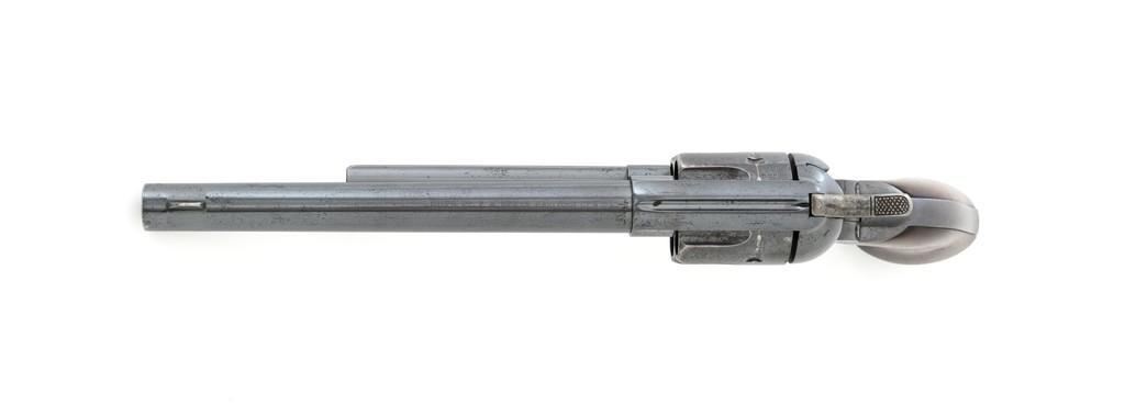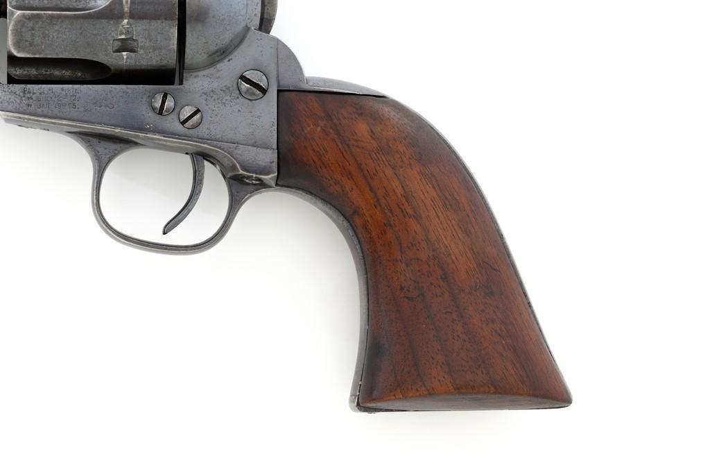 Antique U.S. Colt Single Action Army Cavalry Revolver Issued to U.S. Post Office Department, with Kopec Letter, #120049, .45 Colt cal., 7.5'' barrel, full blue ''arsenal refinish", smooth walnut grips, blade front and fixed ''V''-notch rear sight. All matching numbers located on the frame, barrel, cylinder, trigger guard, and backstrap. Lower left side of the frame is marked ''U.S''. ''D.F.C.'' inspector's marks can be found on the bottom of the frame, rear bottom of the barrel, and rear round of the cylinder. Underside of the barrel and rear round of the cylinder also with a small ''P''; small ''G'' in the frame's hammer well. Assembly number ''37'' is stamped inside the loading gate. No inspector cartouche is visible on either grip panel. Mfg'd circa 1887. Revolver is in fine condition, retaining approx. 85% Ordnance Dept. refinish, showing general thinning and toning. Front and backstrap have worn to primarily gray, with darker toning to the hammer. Grips have been sanded and are now relatively smooth, showing intermittent light handling marks, few areas of darkening along the edges, and moderate shrinkage. Action is crisp, cycles smoothly, but is missing the second click and the cylinder will not turn freely. Bore is bright with defined rifling. This desirable Colt is accompanied by several documents, including a 1996 dated John A. Kopec letter, indicating in summary that this revolver was returned to the Chief of Ordnance, War Dept. by the Post Office Dept. as ''unserviceable'', was refurbished by the War Dept. but not as an artillery model and retained its 7-1/2'' barrel, which was not common. Also, noted by Kopec is in his opinion the revolver retains its ''arsenal refinish'' that was applied after the Railway Mail Service returned it, grips have been sanded, lower forward portion of the grip strap with a laterally drilled hole, and the base pin being a later replacement. There are also copies of additional written communications between the two Departments relative to policies & procedures to resolving the repair/return of the gun. In closing, Kopec's letter is complimentary of the work done on this ''historically correct'' SAA revolver. Overall, an interesting revolver, with accompanying documentation. Est.: $5,000-$7,000. (Antique)