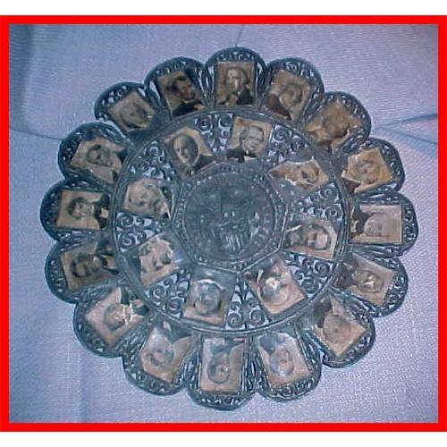 What was this lead filigree plaque was used for? This molded lead plague has paper "stamps" of each United States presidents from Washington through McKinley. Size of this antique lead plaque is 7-1/4" in diameter. Fair condition with some paper damage and minor cracking along filigree edge(SEE PHOTO). I bought this from a large political collector several years ago in Minnesota.