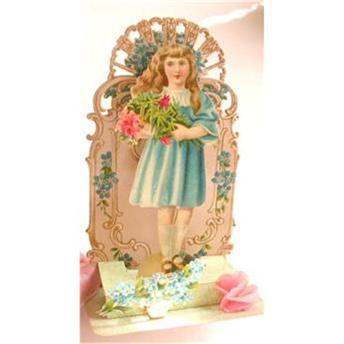 The little girl in this 3 layer foldout Valentine, wears Mary ane shoes & sock. She has a little pink honeycomb flower at her feet. With long hair, she carries lilies. The back layer is embossed with gold touches on scrolls & forget-me-nots. This card is circa 1909. 6" high & 3 3/8" wide. Condition is good. There is some staining on the bottom of the base which folds up.