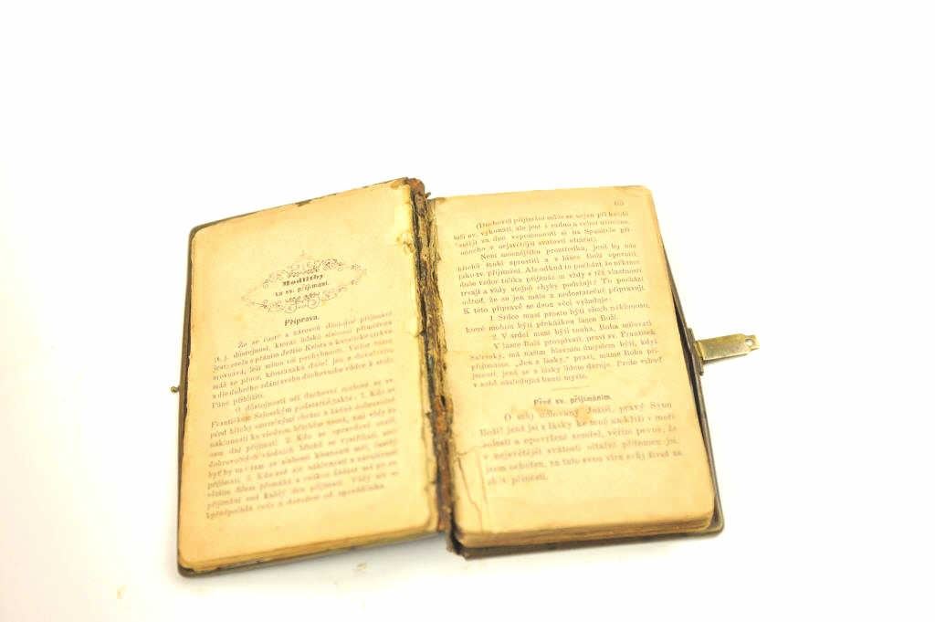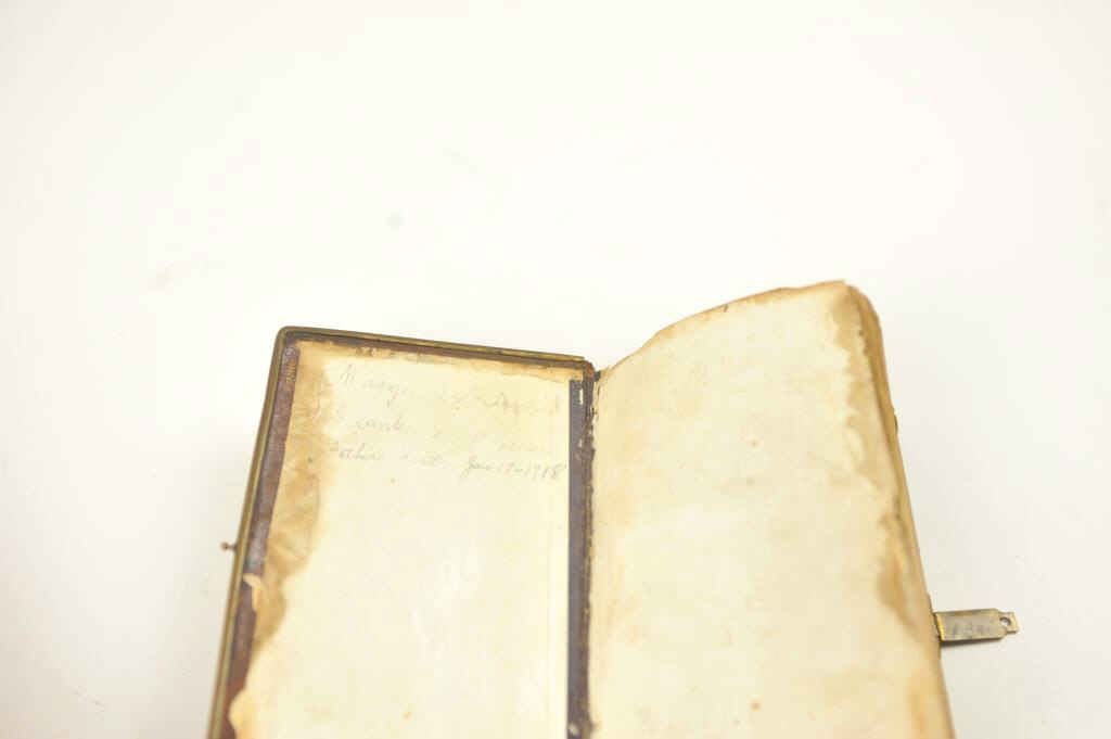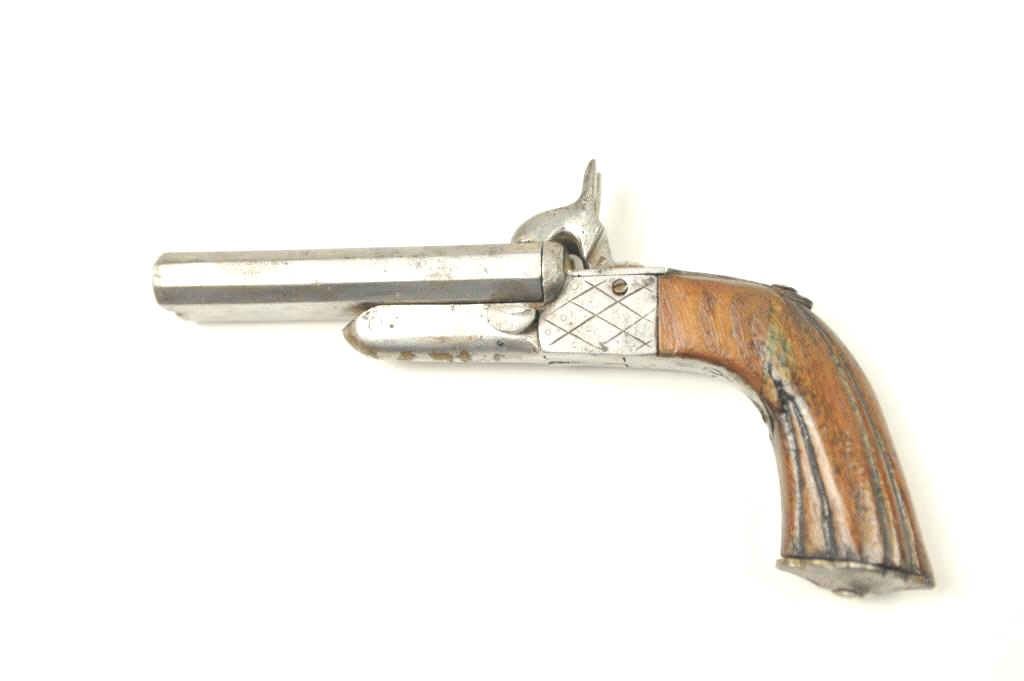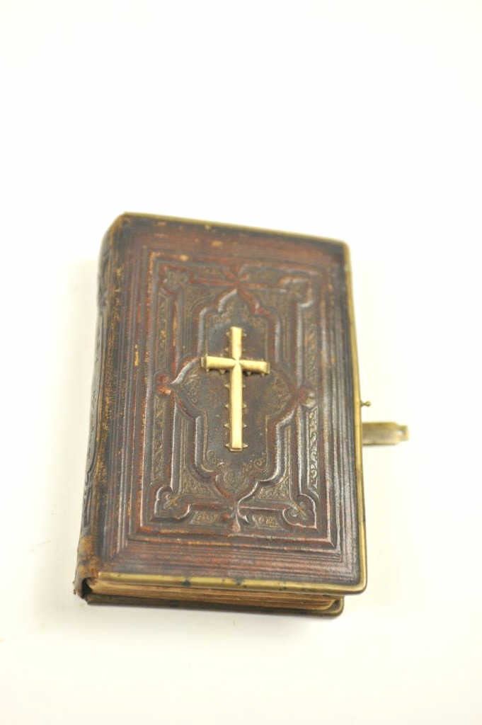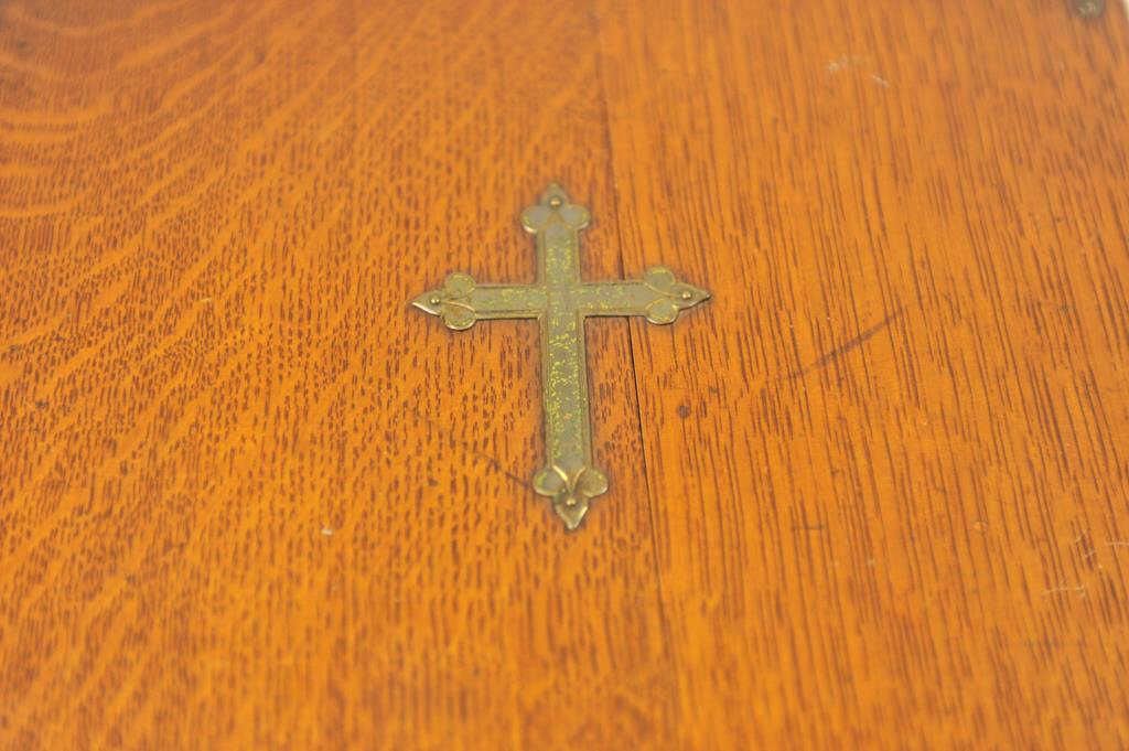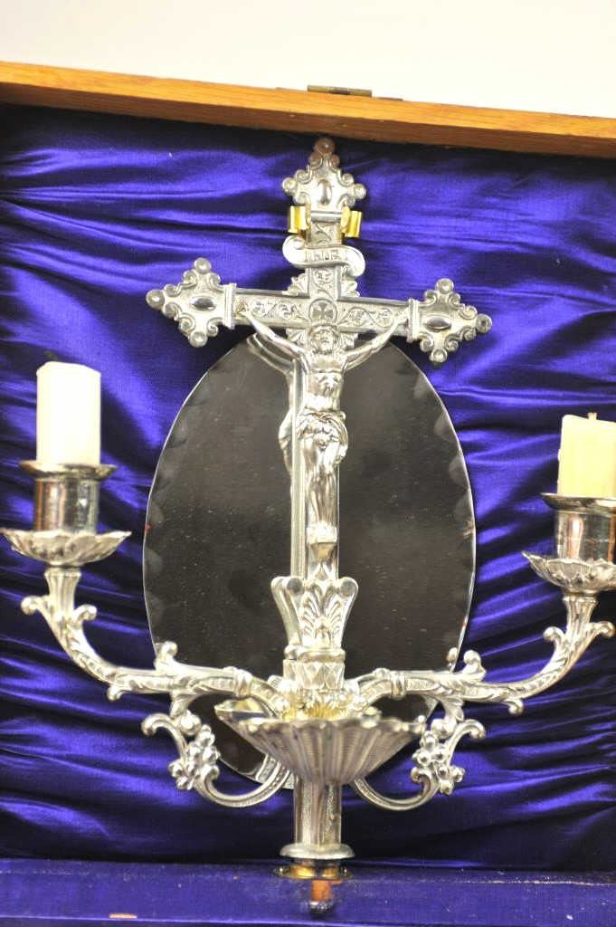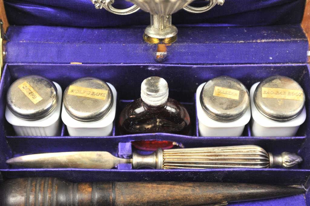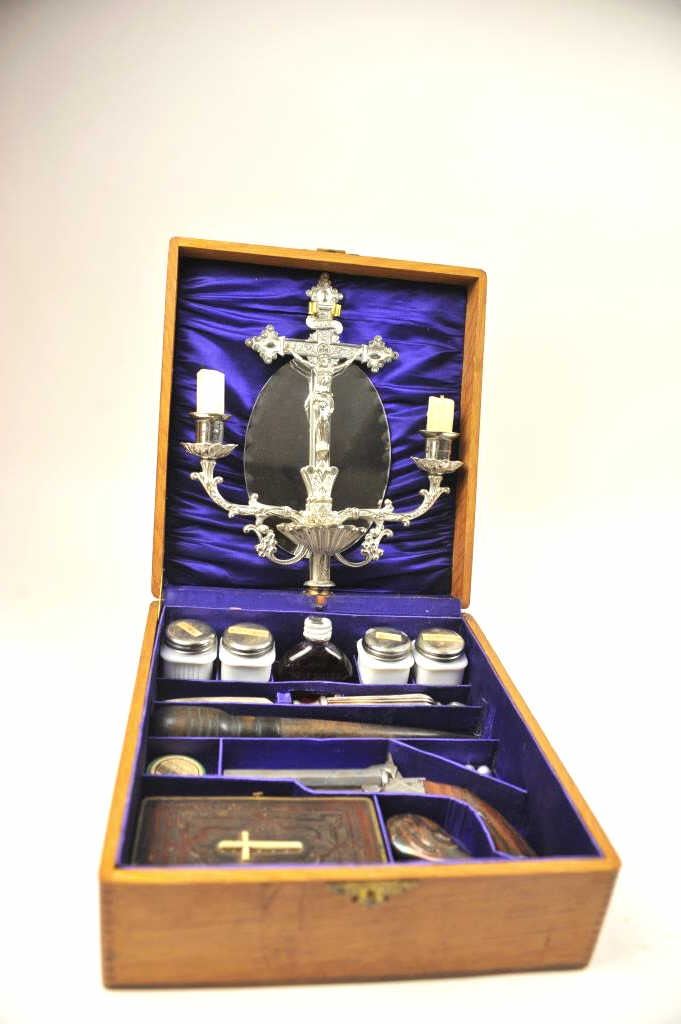 Antique Vampire kit in wooden case, including a crucifix with two candles and a holy water font which stands on the lid of the case in front of an oval mirror. There are containers for garlic, wolfs bane, holywater, elixir and bao-bab root. Also included are the weapons required for slaying the undead, including a silver dagger measuring 9 ½” overall with a 3 ½” blade, a wooden stake 9 5/8” in length and 1 ¼” indiameter, an antique Belgian pinfire revolver with 4” barrels, 7 ¾” overall, with silver cast balls, a powder flask, percussion caps, and antique bible in an eastern European language, possibly Romanian? The interior of the case is fitted for each of the items and lined in purple satin fabric, which remains in very good condition overall. The exterior of the case is made of oak, and measures 10 5/8” x 11 ½ x 4 ½”, with dovetailed edges and blind hinges. The lid of the case has brass decorative edges and a cross in the center. Est. $1250-2500