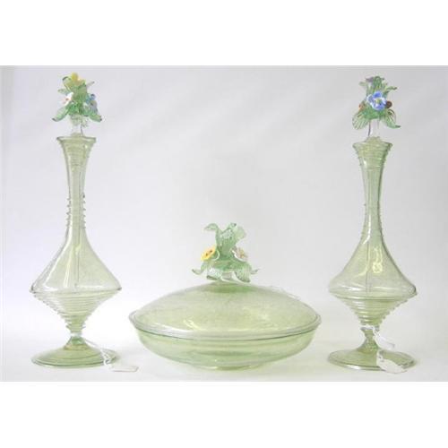 This antique Venetian glass vanity set includes a covered dish and two tall perfume bottles with their original stoppers. Overall condition is very good, with no cracks or restorations, but there are some missing leaves and flower petals from the stoppers and top of the dish. Dish measures 5 1/4" high by 7 1/4" across and perfume bottles measure 11" tall by 3 1/4" across. Total weight of the set is 2 lbs. 5 oz. Maker is not known. No hallmarks. Lovely gold speckled transparent greent color.