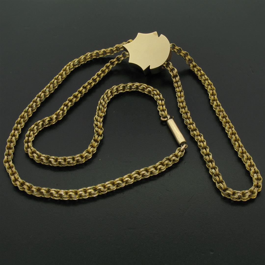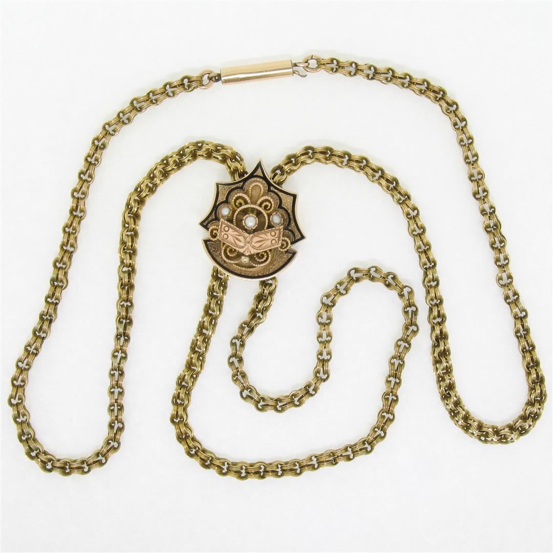 Antique Victorian 10K Gold Pearl Enamel Hand Etched Slide Mobile Pendant & Chain. Please see photos and description for all available information. An antique victorian solid 10k yellow and rose gold slide pendant and necklace, with 3 round shape natural pearls (2.00-2.30mm). The pendant weighs a total of 19.46 grams, measures 25.0x22.0mm including the bail, and 25 inch Dual Rolo link chain
