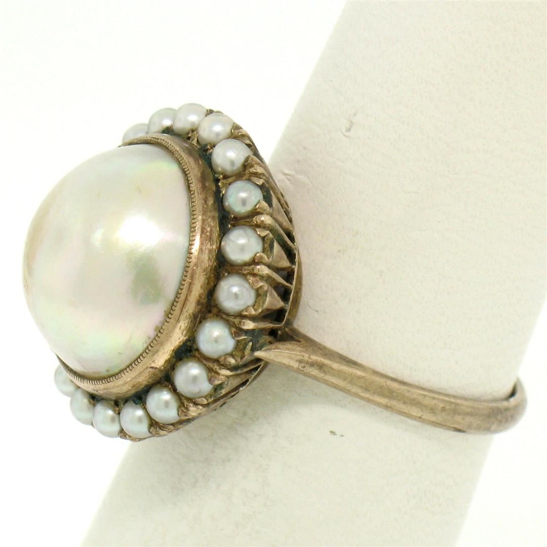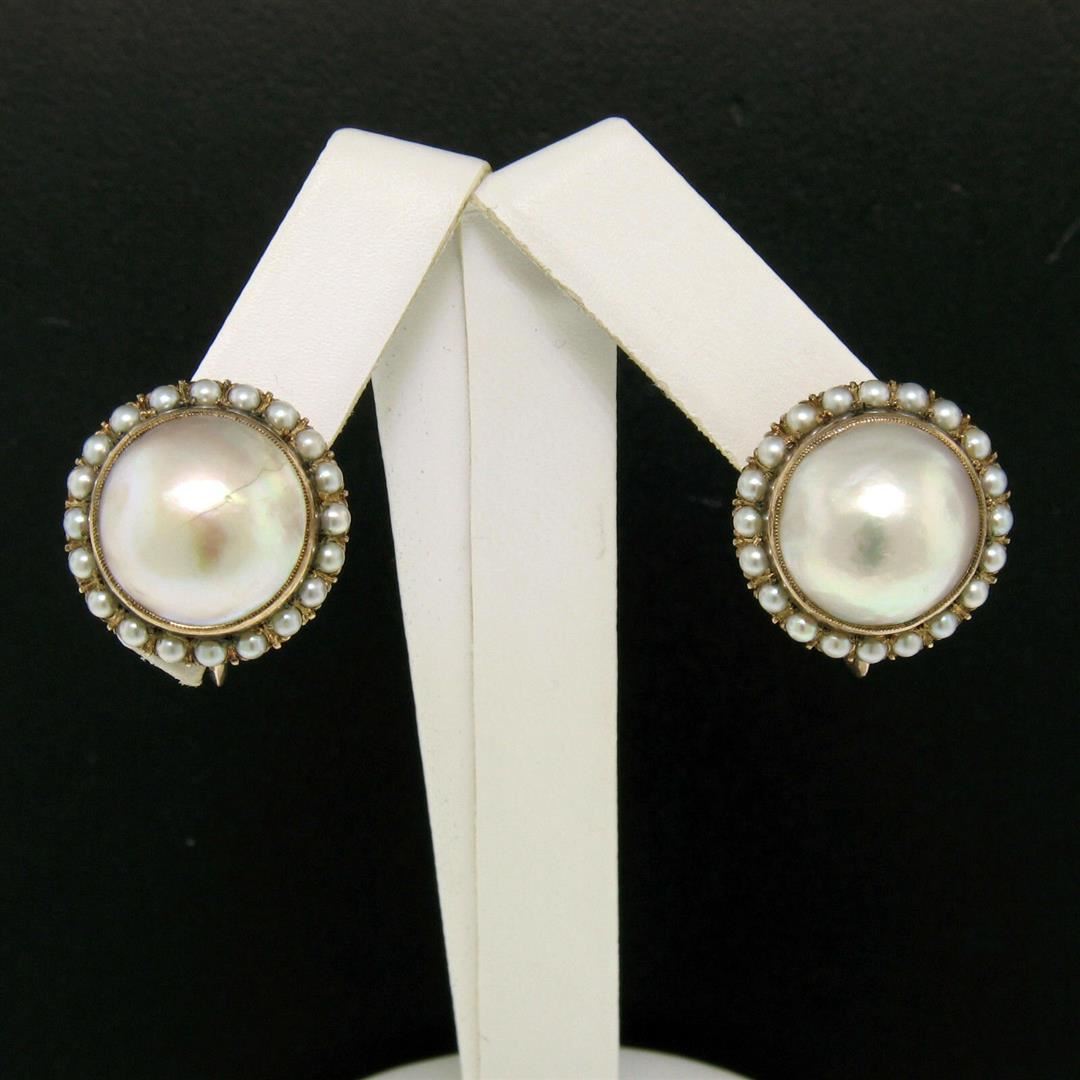 One Pair Antique Victorian 10K Rose Gold Bezel Mabé Prong Seed Pearl Ring & Earrings Set. Item Details: Material:  10k Solid Rose Gold, Weight:  18.3 Grams, Stone(s):  (3) Natural Genuine Mabé Pearls - Round Cabochon Shape - Bezel Set - Pinkish Off-White Color - 13.0mm (approx.), (60) Natural Genuine Seed Pearls - Prong Set - Ivory Color - 2.0mm (approx.), Ring Size: 6.25 , Ring Width:  17.40mm, Ring Height:  11.56mm rise off the finger, Earrings Backing:  Screw Back w/o Posts (no pierced earring needed) Earrings Width:  17.40mm Earrings Height: Condition:  Antique - Excellent Condition! 11.56mm