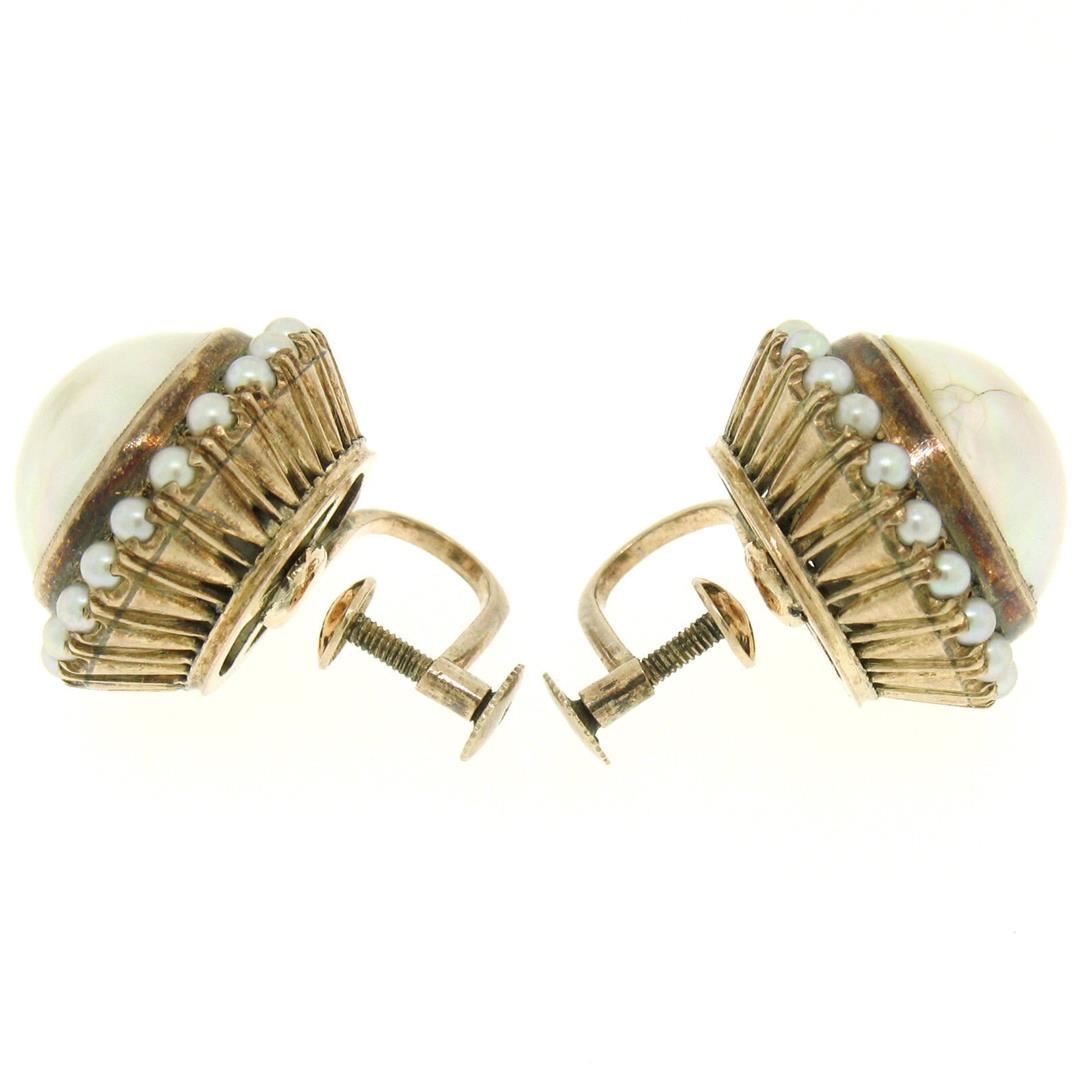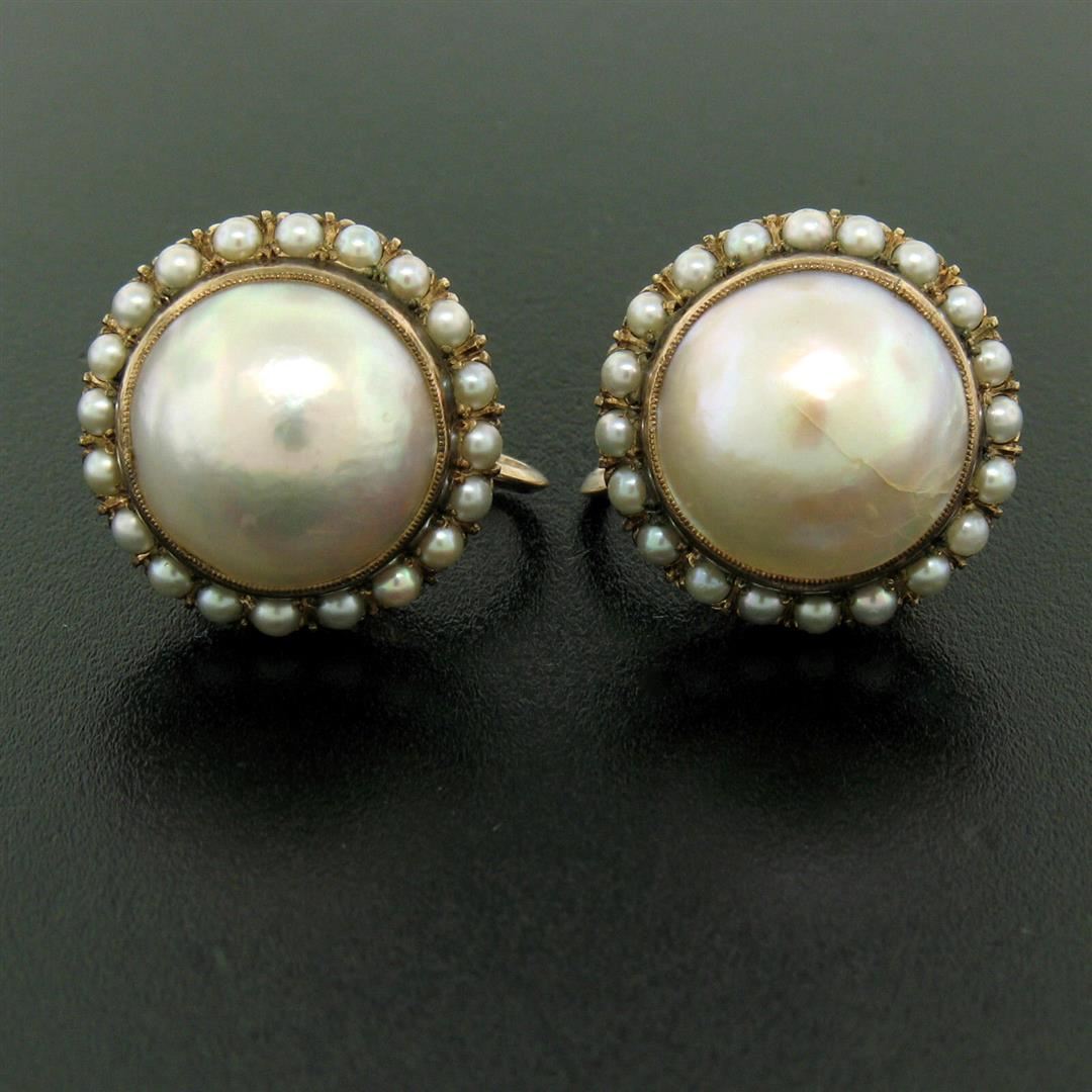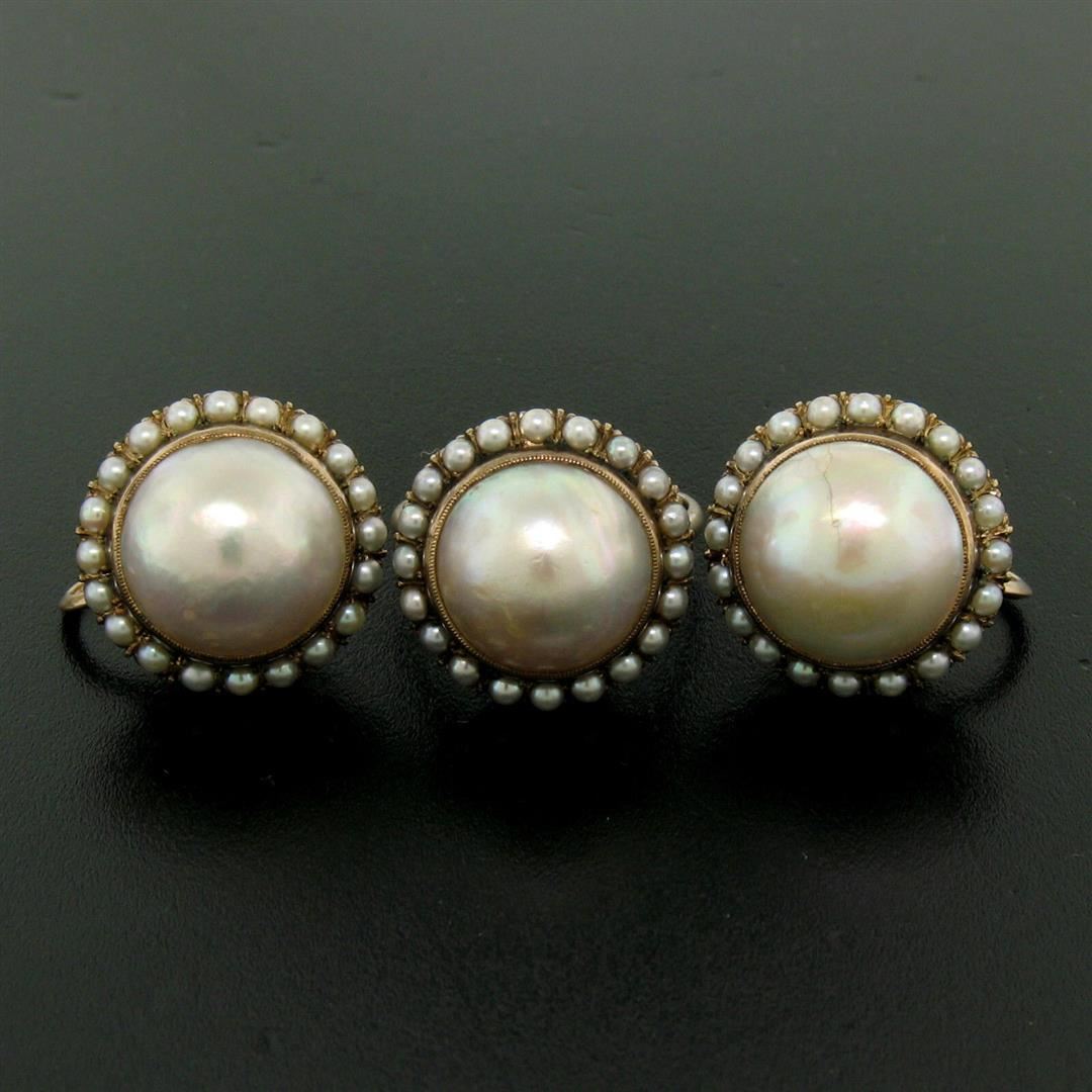 An antique victorian solid 10k rose gold set of earrings and ring, featuring 3 round natural mabe pearls (13.0mm ) with a halo of 60 natural seed pearls (2.0mm). The earrings measure approximately 11.56x17.40mm and weigh a total of 18.3 grams. The ring is