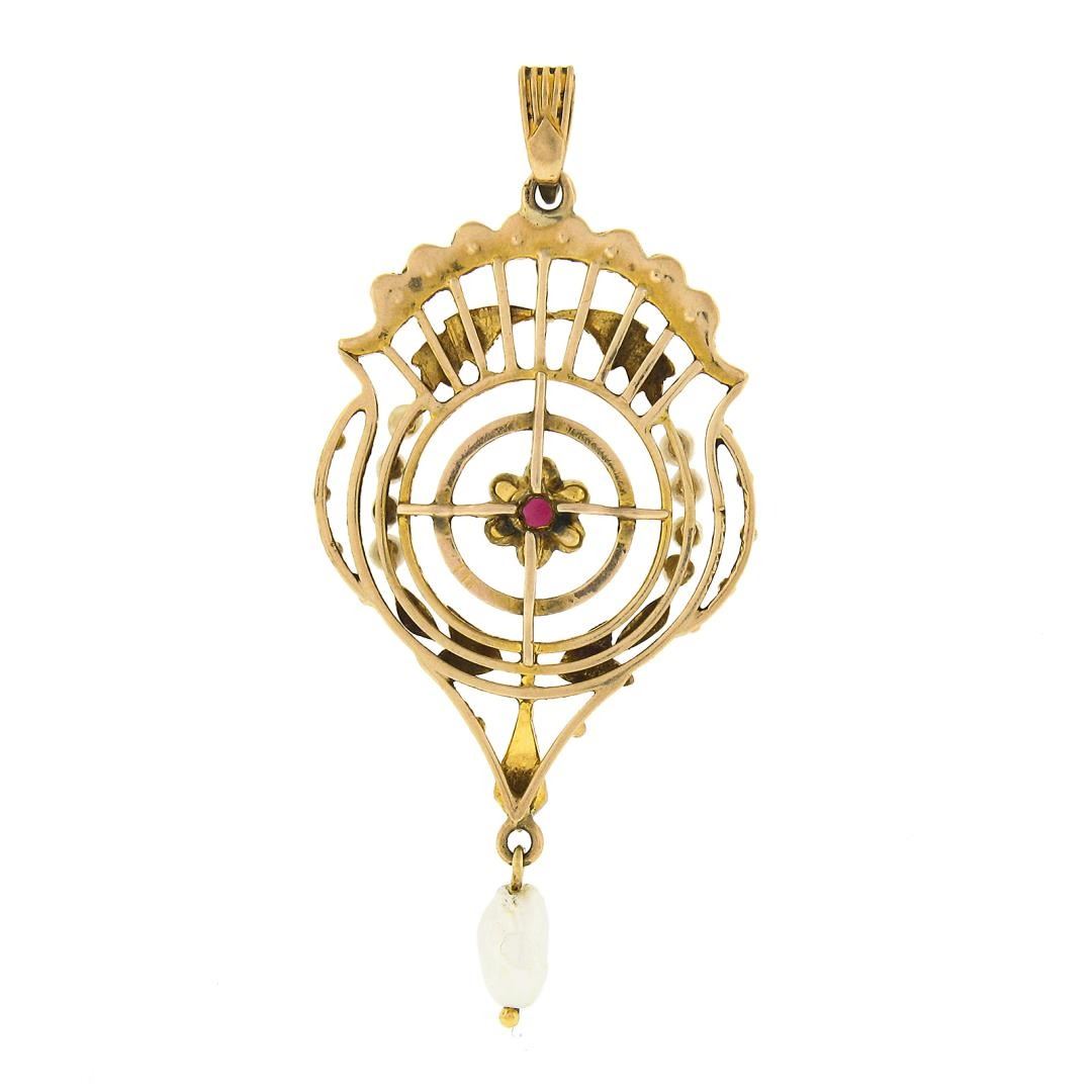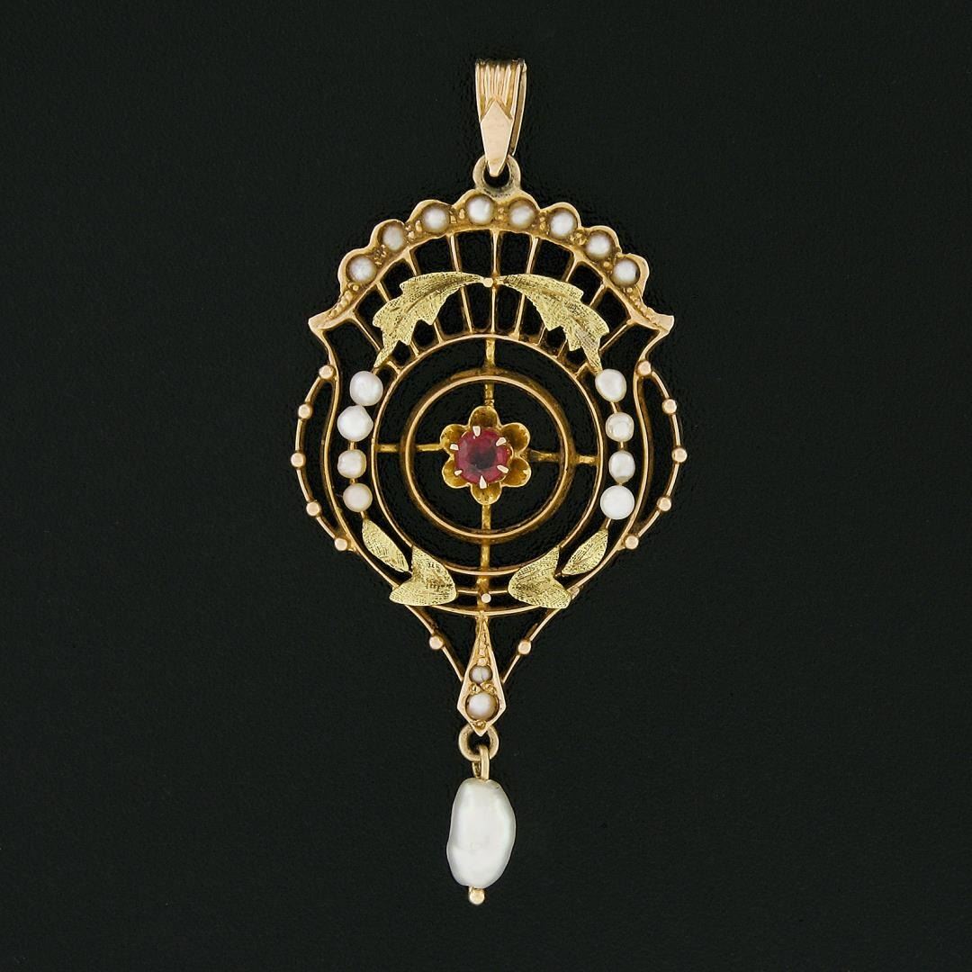 An antique solid 10k yellow & white gold lavalier pendant, with 1 round cut red stone (3.1mm ), 18 round shape cultured seed pearls (1.5-2.0mm each), and 1 baroque shape cultured pearl (6.4x4mm). The pendant weighs a total of 3.16 grams, measures 49.6x23mm including the bail, and the inside of the bail measures 4.5x2.4mm.