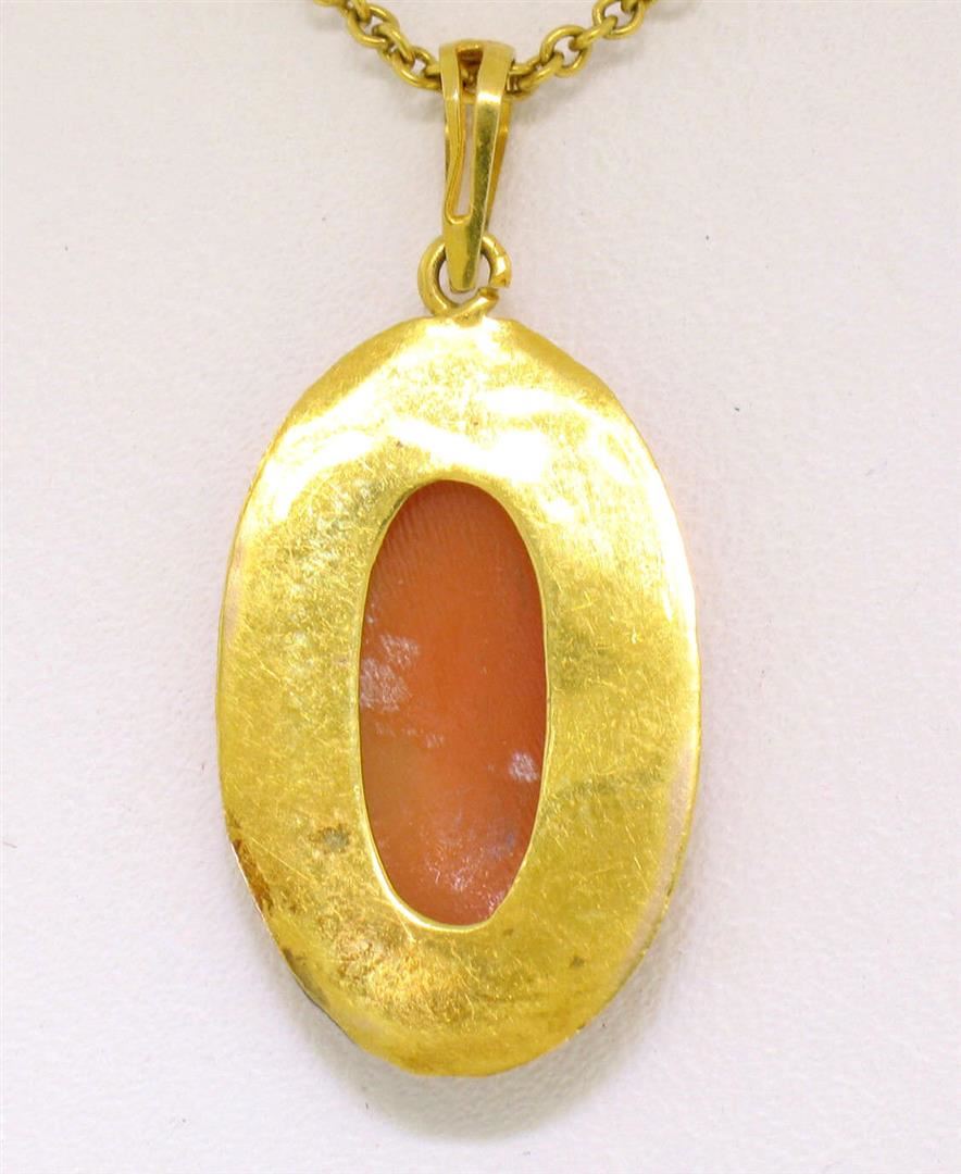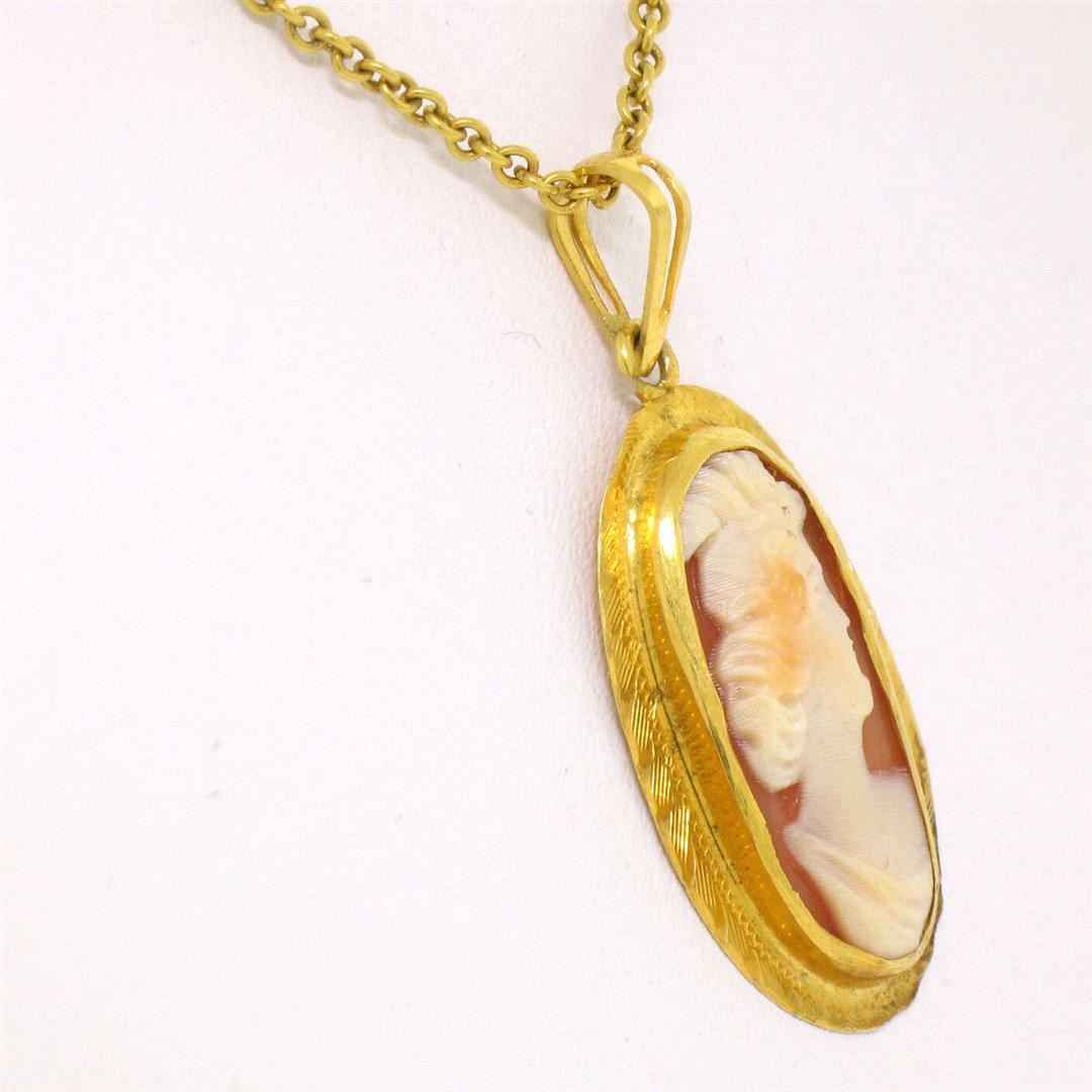 An antique victorian solid 10k yellow gold pendant necklace, with 1 oval cut natural carved shell cameo (18.35x9.43mm). The pendant weighs a total of 2.9 grams, measures 23.60x13.31mm including the bail, and 16 inch cable link chain.