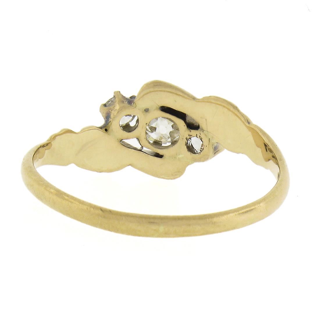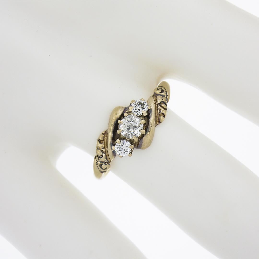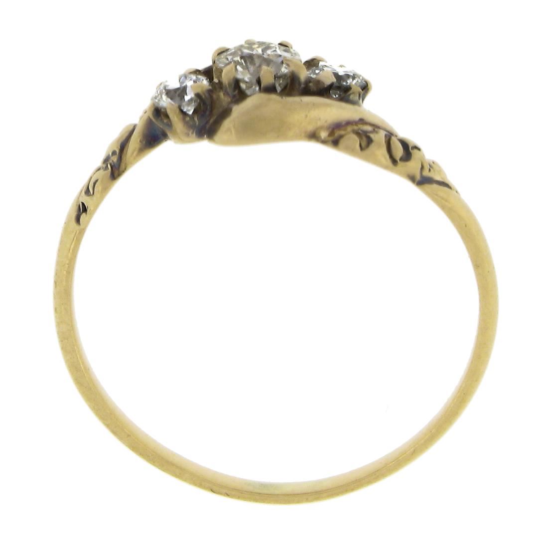 An antique solid 10k yellow gold ring, with 3 old eurepean & old mine cut natural diamonds (H-J - VS2-SI2 ; 0.34ctw). The ring is size 6.75, weighs a total of 1.55 grams, and measures 7.9mm wide.