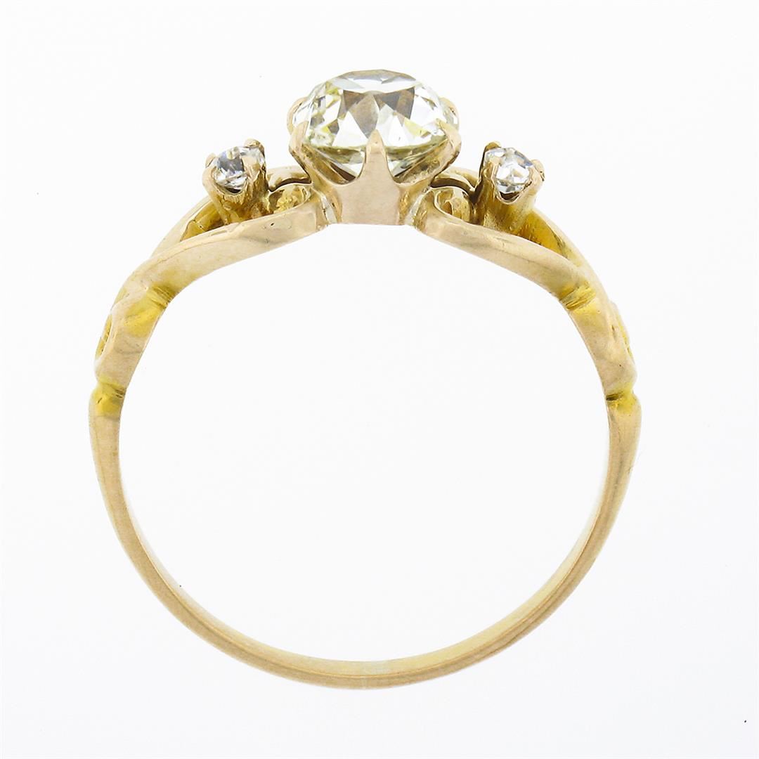 An antique solid 10k yellow gold engagement ring, with 1 old mine cut natural diamond (O/P - SI1 ; 1.29ct), accented with 2 old mine cut natural diamonds (G/H - VS2/SI1 ; 0.10ctw). The ring is size 8.5, weighs a total of 2.40 grams, and measures 7.90mm wide.