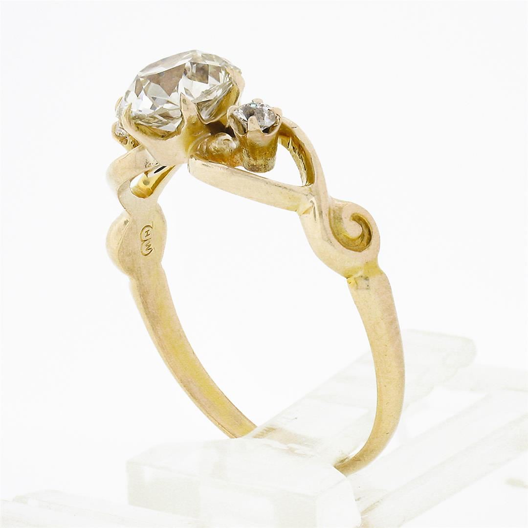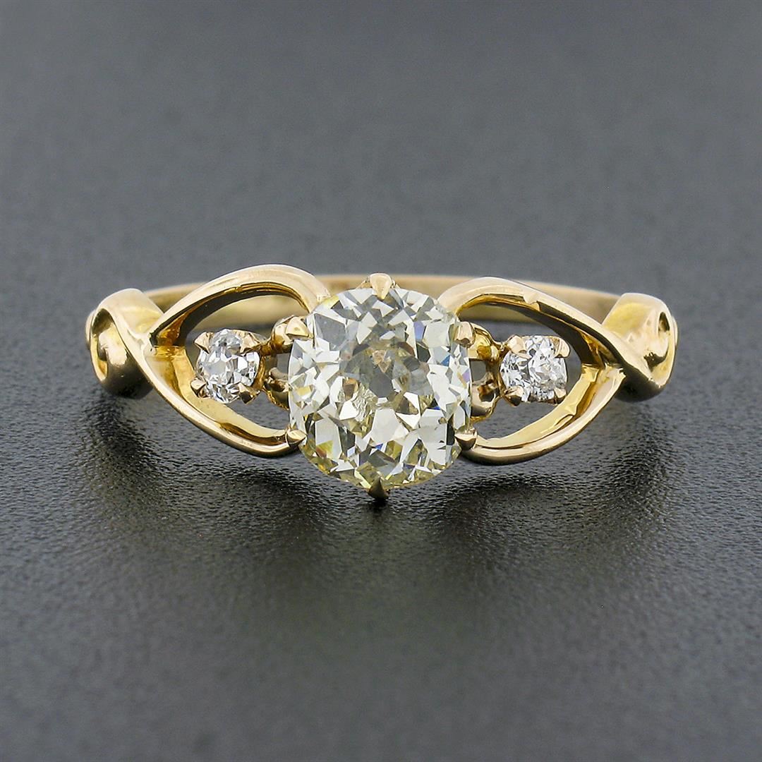 An antique solid 10k yellow gold engagement ring, with 1 old mine cut natural diamond (O/P - SI1 ; 1.29ct), accented with 2 old mine cut natural diamonds (G/H - VS2/SI1 ; 0.10ctw). The ring is size 8.5, weighs a total of 2.40 grams, and measures 7.90mm wide.