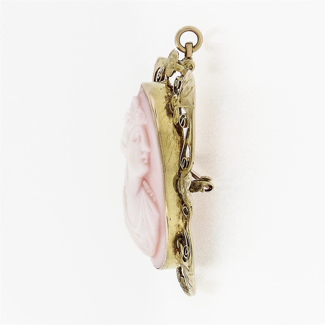 An antique victorian solid 10k yellow gold pin brooch pendant, with1 oval shape carved cameo shell (29.40x22.33mm). Measures 39.06mx32.92mm and weighs a total of 7.45 grams.