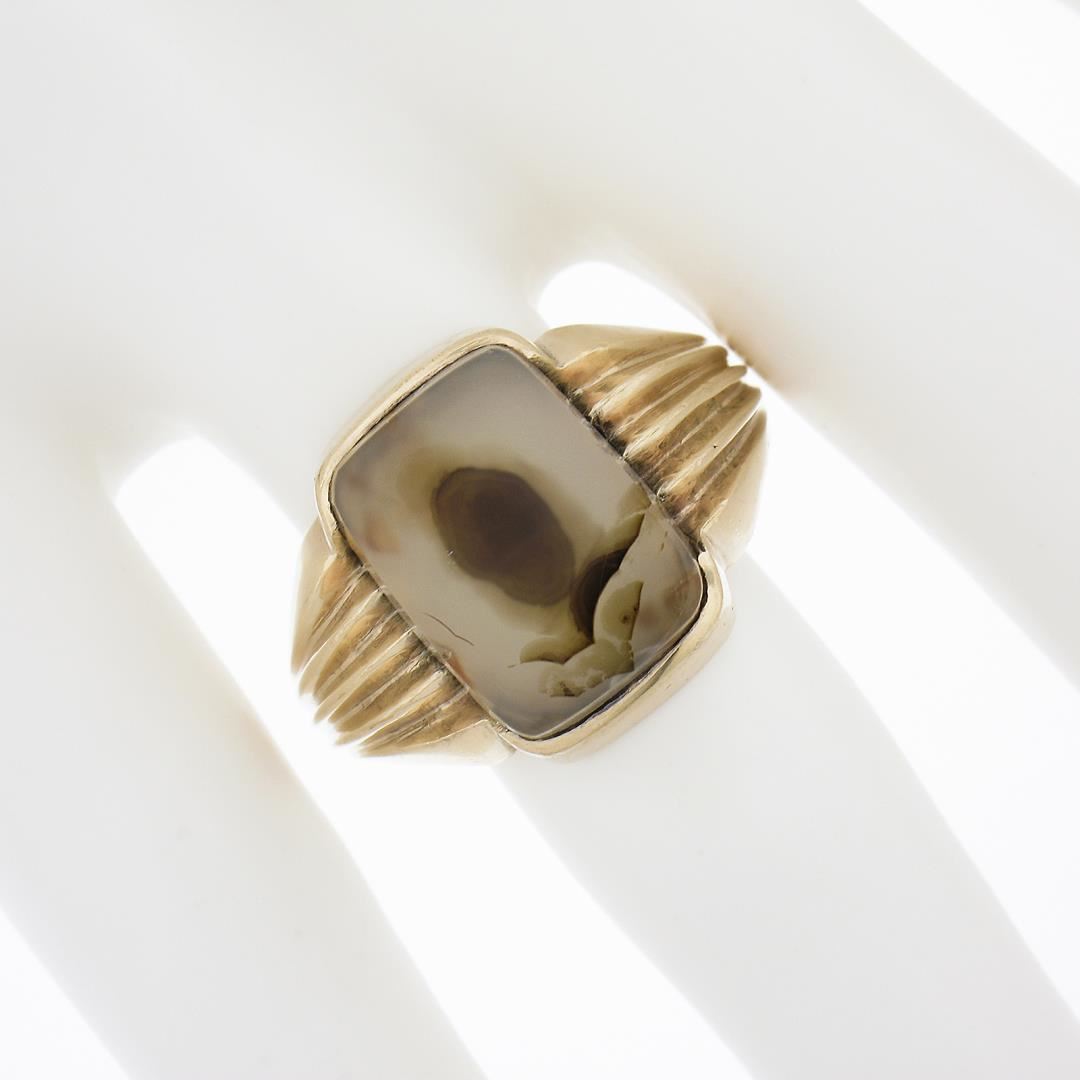 An antique solid 10k yellow gold ring, with 1 rectangular cut natural moss agate (14.3x10.5mm). The ring is size 11, weighs a total of 8.58 grams, and measures 17.1mm wide.