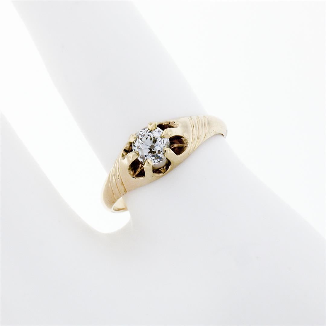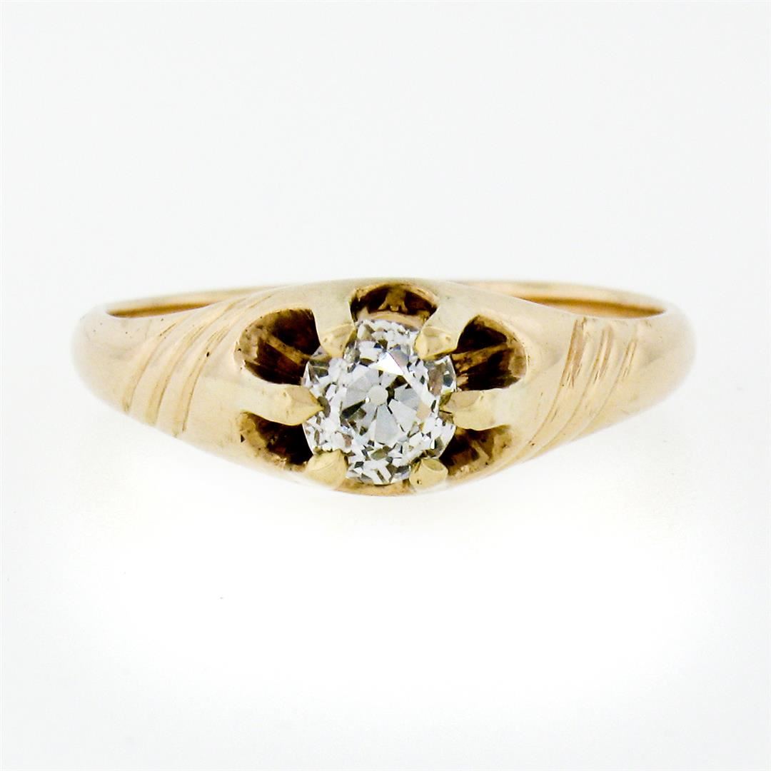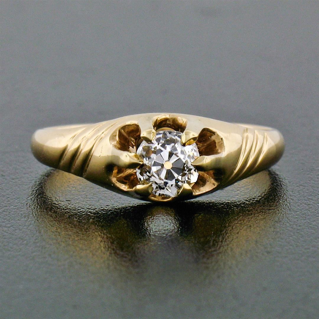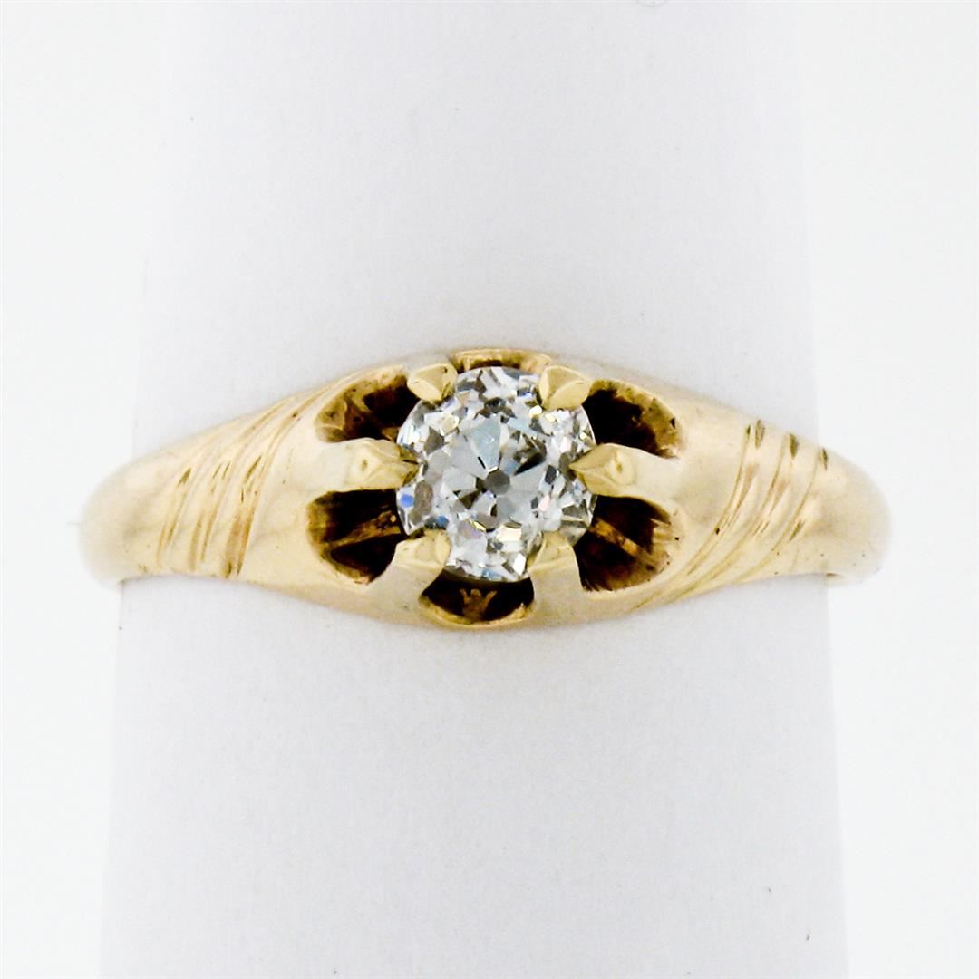 An antique solid 14k yellow gold solitaire belcher ring, with 1 cushion old cut natural diamond (G - VS1; 0.40ct). The ring is size 4.5, weighs a total of 2.08 grams, and measures 6.0mm wide.