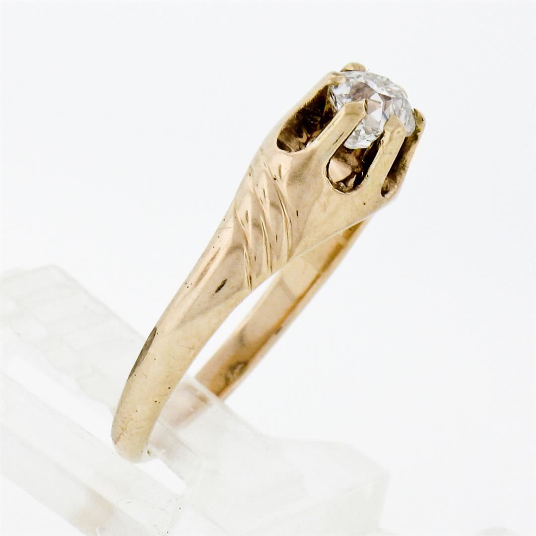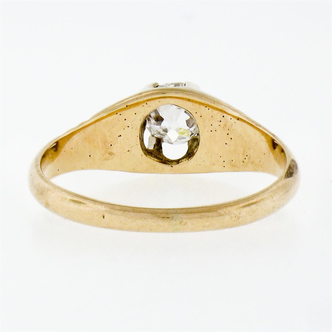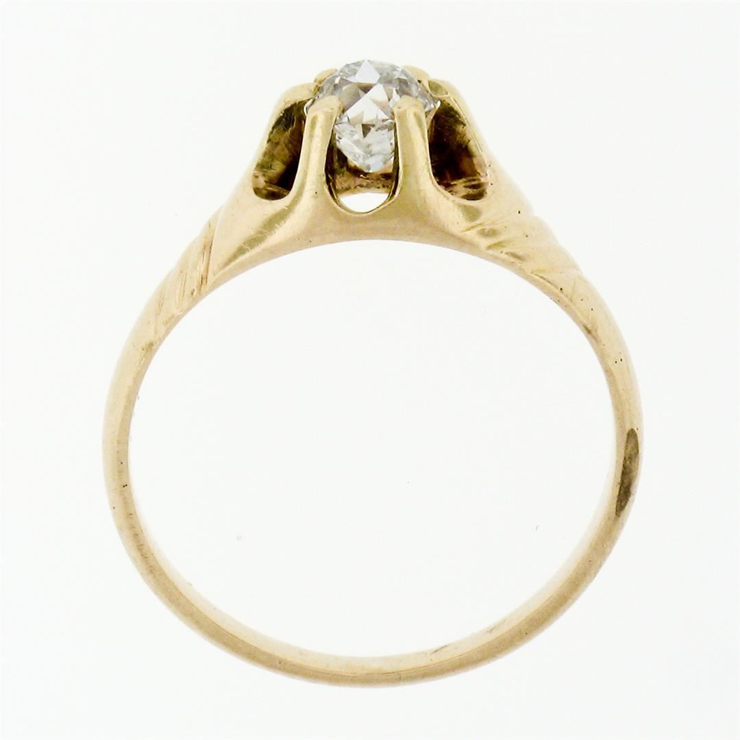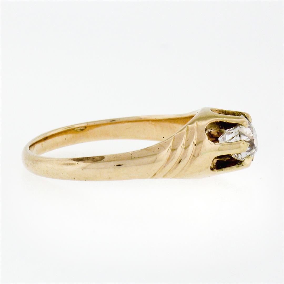 An antique solid 14k yellow gold solitaire belcher ring, with 1 cushion old cut natural diamond (G - VS1; 0.40ct). The ring is size 4.5, weighs a total of 2.08 grams, and measures 6.0mm wide.