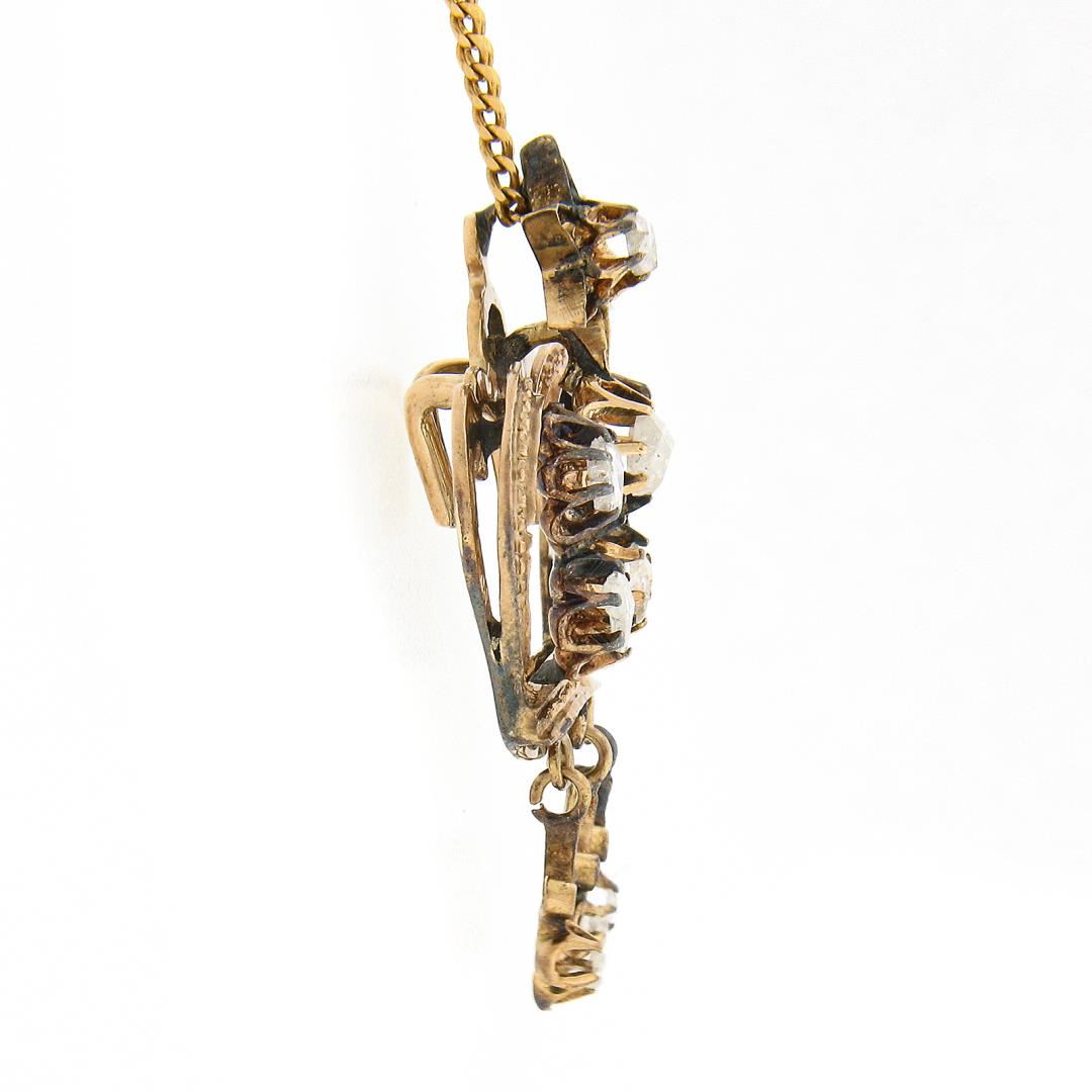 A antique solid 14k yellow gold dangle pendant necklace, with 10 old rose cut natural diamonds (G/H - SI1/SI2 ; 0.78ctw). 15.75 inch curb link chain, 5.81 grams total weight, pendant measures 32.40x21.70mm.