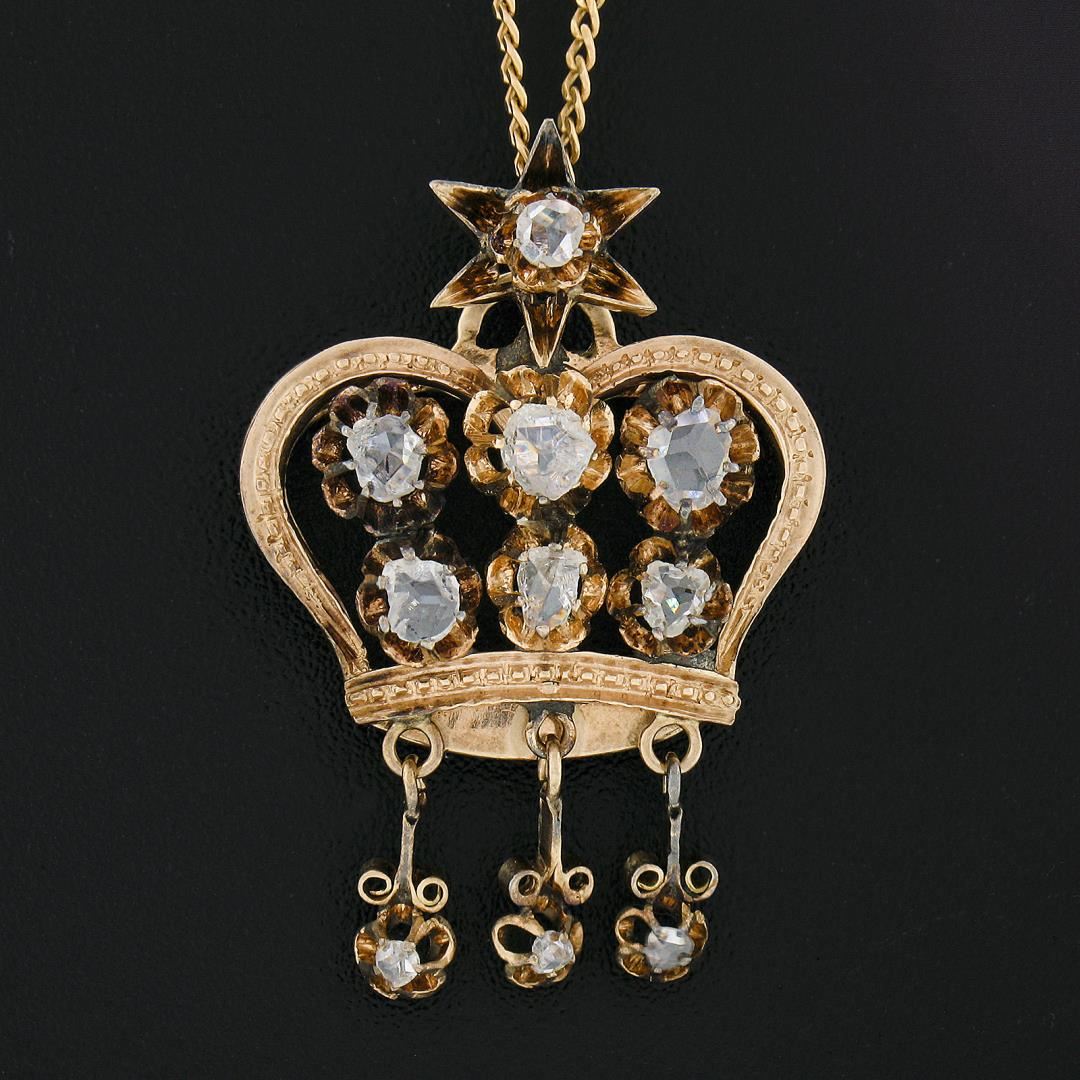 A antique solid 14k yellow gold dangle pendant necklace, with 10 old rose cut natural diamonds (G/H - SI1/SI2 ; 0.78ctw). 15.75 inch curb link chain, 5.81 grams total weight, pendant measures 32.40x21.70mm.