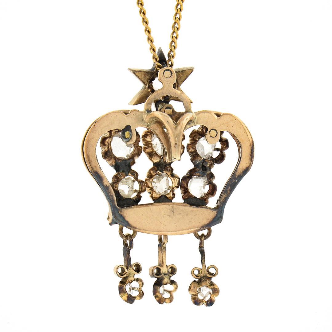 Antique Victorian 14K Gold.78 ctw Diamond Open Star Crown Dangle Pendant & Chain