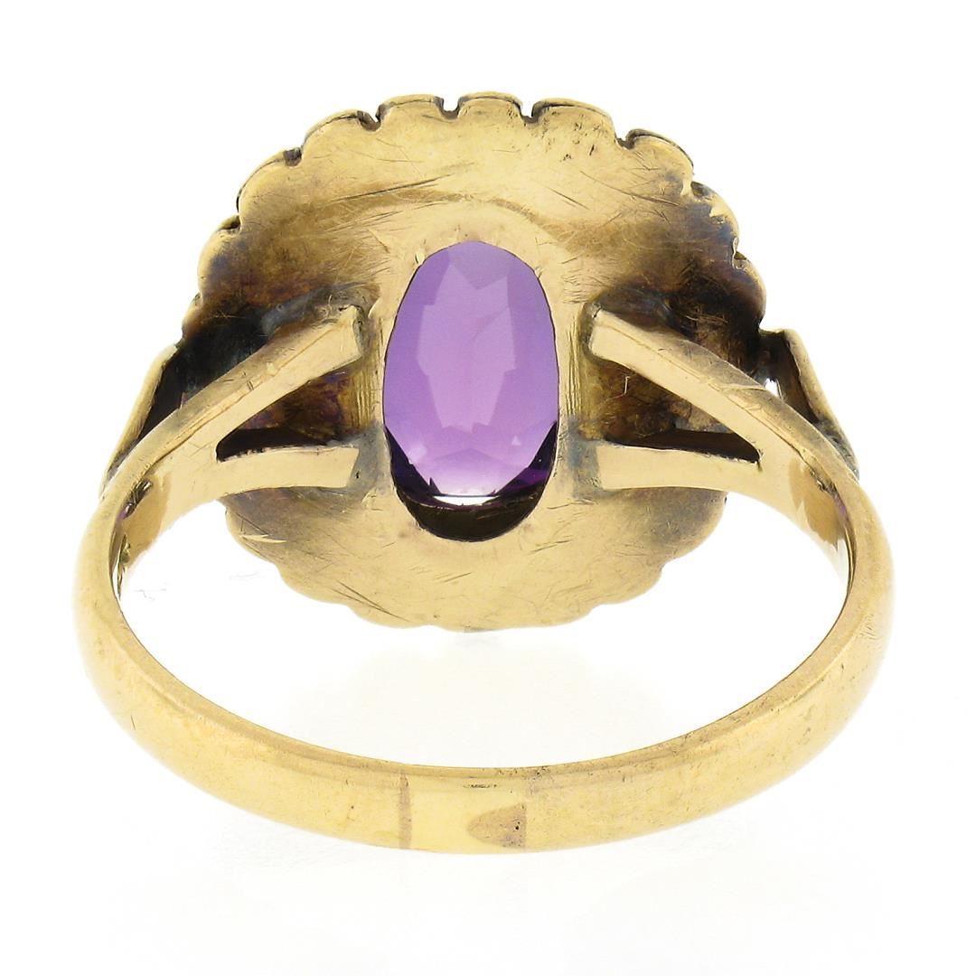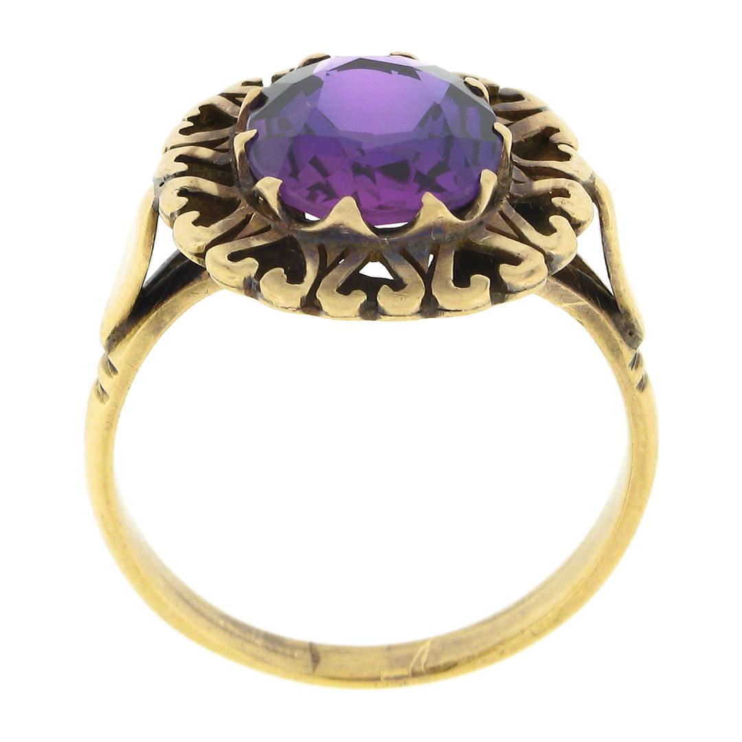 An antique solid 14k yellow gold ring, with 1 oval cut natural amethyst (3.50ct). The ring is size 8.0, weighs a total of 4.10 grams, and measures 17.4mm wide.