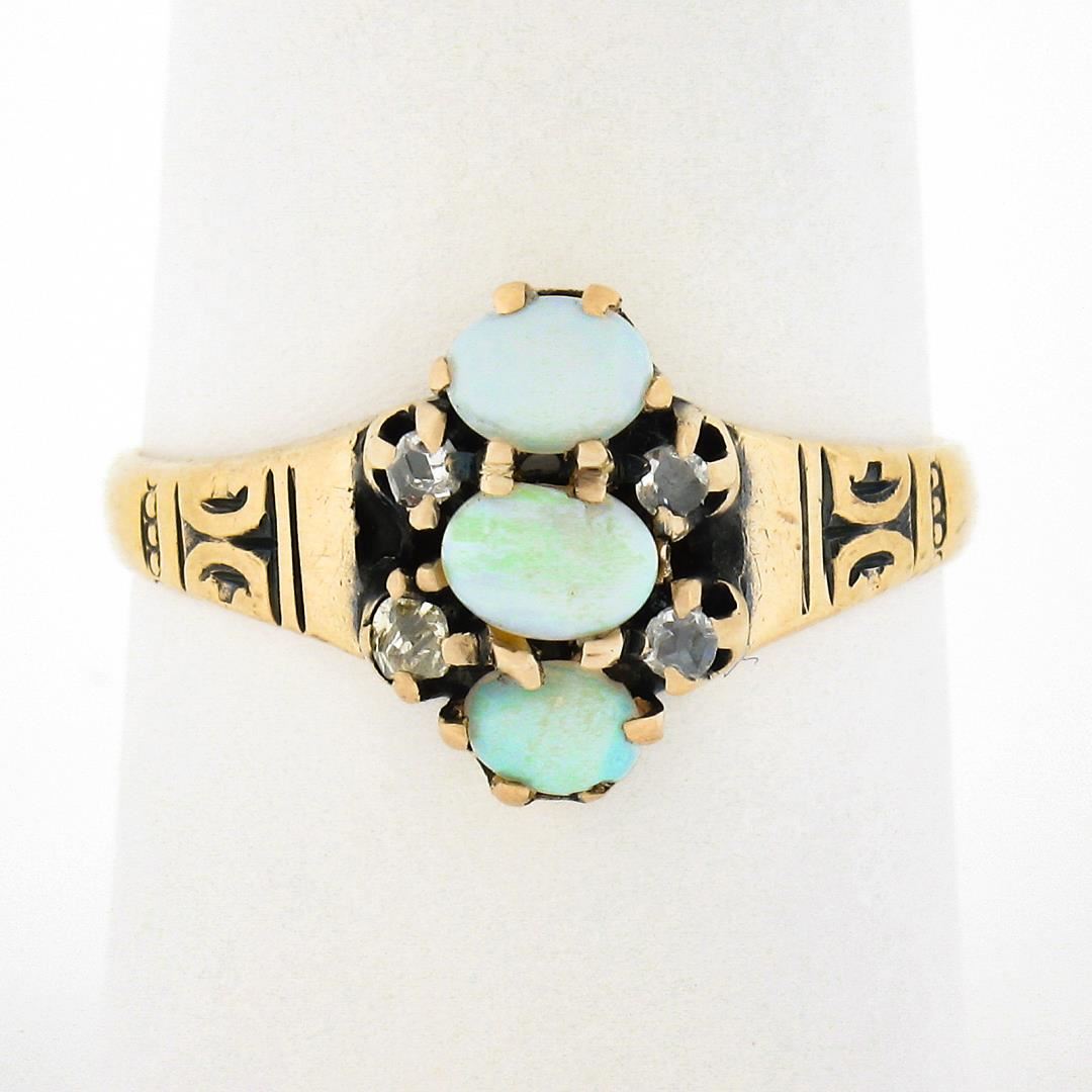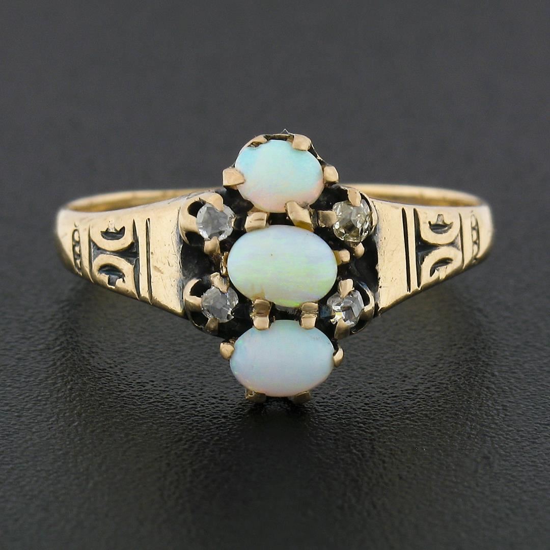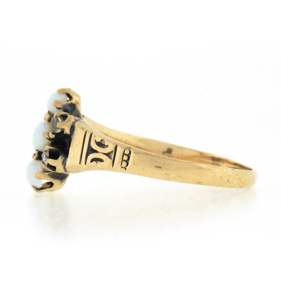 An antique solid 14k yellow gold ring, with 3 oval cabochon cut natural opals (4.6x3.2mm to 3.8x2.8mm each), and 4 rose w/ single cut natural diamonds (H-J - SI1/SI2 ; 0.06ctw). The ring is size 7.5, weighs a total of 2.20 grams, and measures 11.2mm wide.