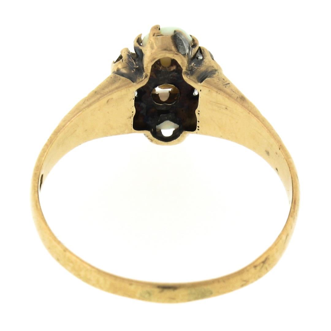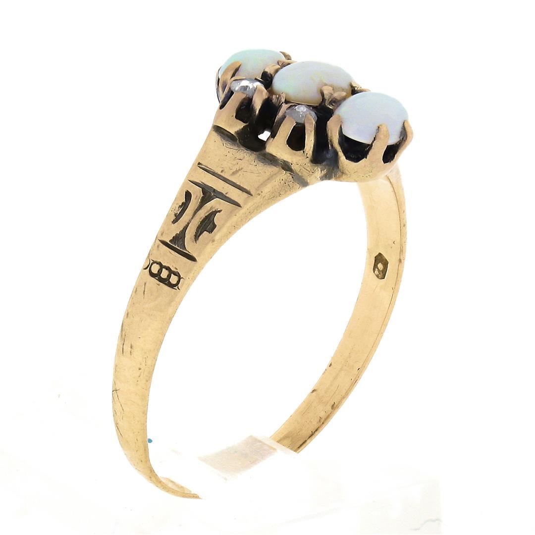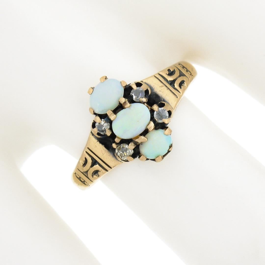 An antique solid 14k yellow gold ring, with 3 oval cabochon cut natural opals (4.6x3.2mm to 3.8x2.8mm each), and 4 rose w/ single cut natural diamonds (H-J - SI1/SI2 ; 0.06ctw). The ring is size 7.5, weighs a total of 2.20 grams, and measures 11.2mm wide.