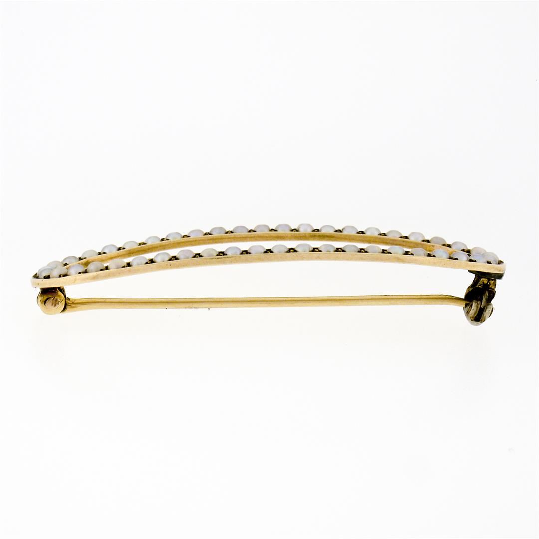 An antique solid 14k yellow gold open brooch, with 45 round shape natural seed pearls. Measures 17.6x43.2mm and weighs a total of 3.35 grams.