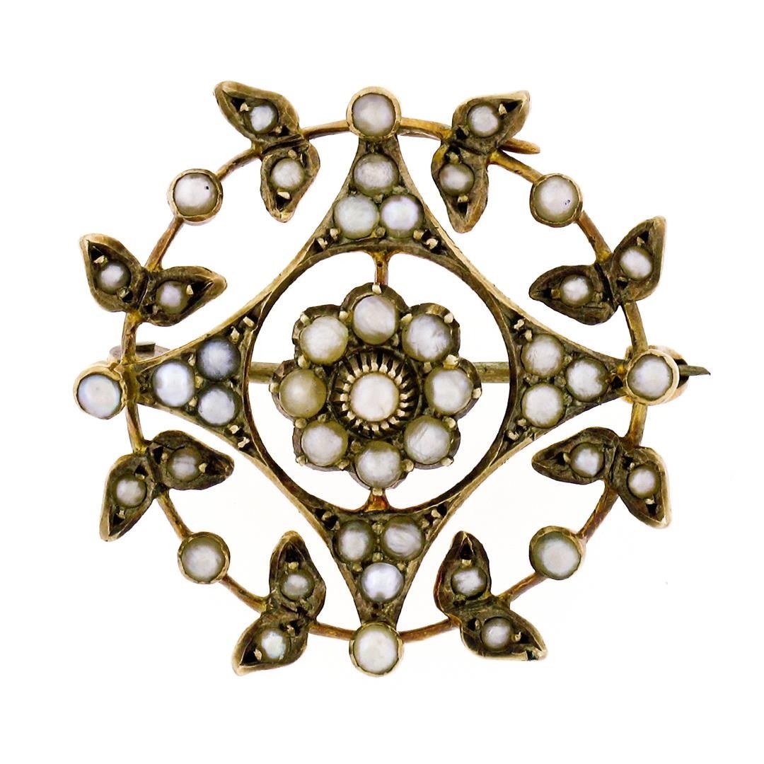 An antique solid 14k yellow gold open round pin brooch, with 43 round shape natural seed pearls (1.35-2.25mm). Measures 29.50mm in diameter and weighs a total of 4.0 grams.