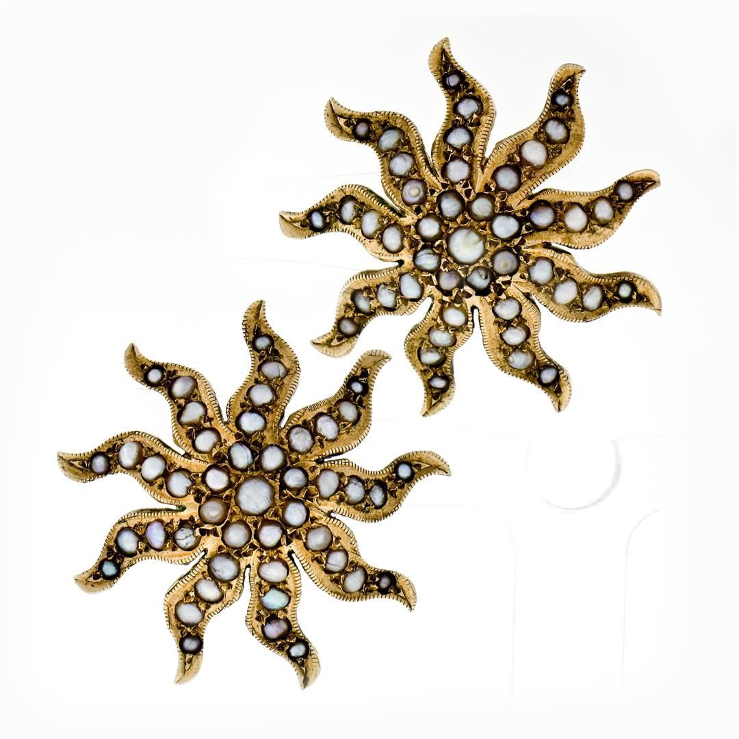 An antique solid 14k yellow gold starburst stud earrings, with 90 round bead shape natural seed pearls (1.30 to 2.50mm). The earrings measure approximately 25.45mm in diameter and weigh a total of 8.0 grams.