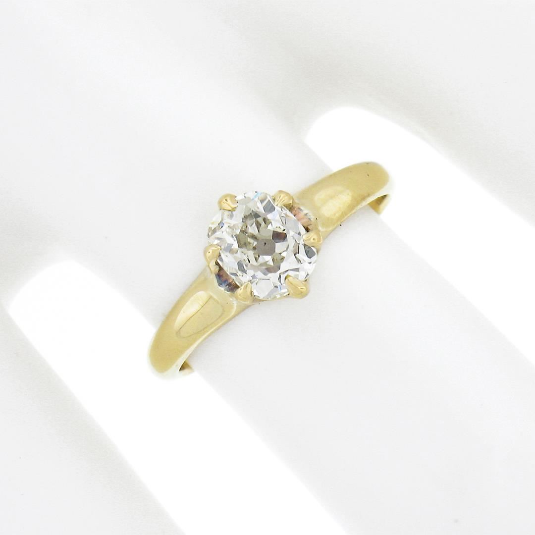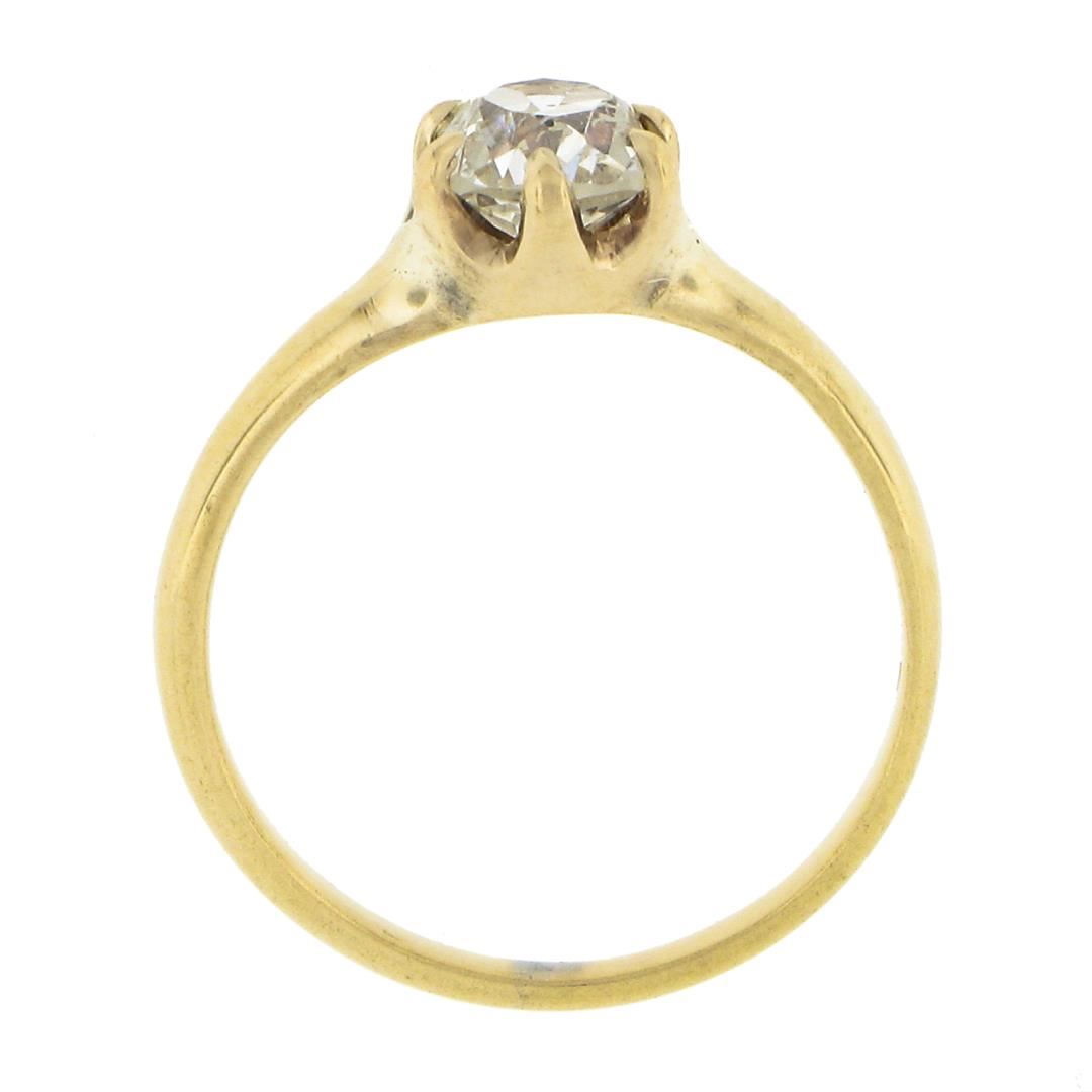 An antique solid 14k yellow gold solitaire engagement ring, with 1 old cushion cut natural diamond (K/L - I1 ; 0.82ct). The ring is size 5.0, weighs a total of 1.96 grams, and measures 7.2mm wide.