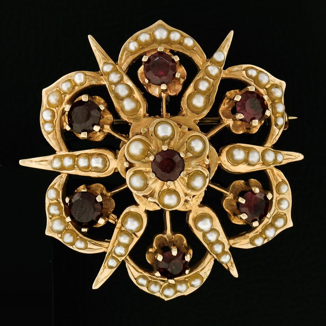 An antique solid 14k yellow gold floral brooch pendant, with 1 old cut natural garnet (1.50ctw), and 60 round shape natural seed pearls (1.50mm to 2.35mm). Measures 32.50x33mm and weighs a total of 8.55 grams.