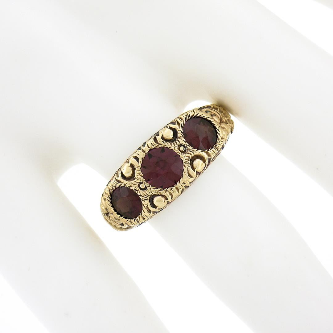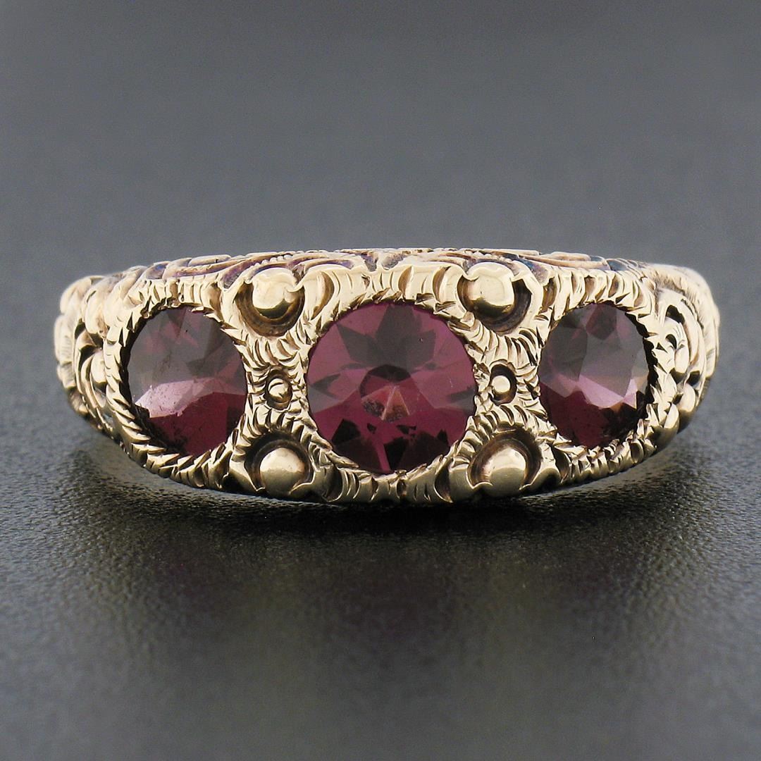 An antique solid 14k yellow gold ring, with 3 old round cut natural rhodolite garnets (1.80ctw). The ring is size 10.5, weighs a total of 6.15 grams, and measures 8.4mm wide.