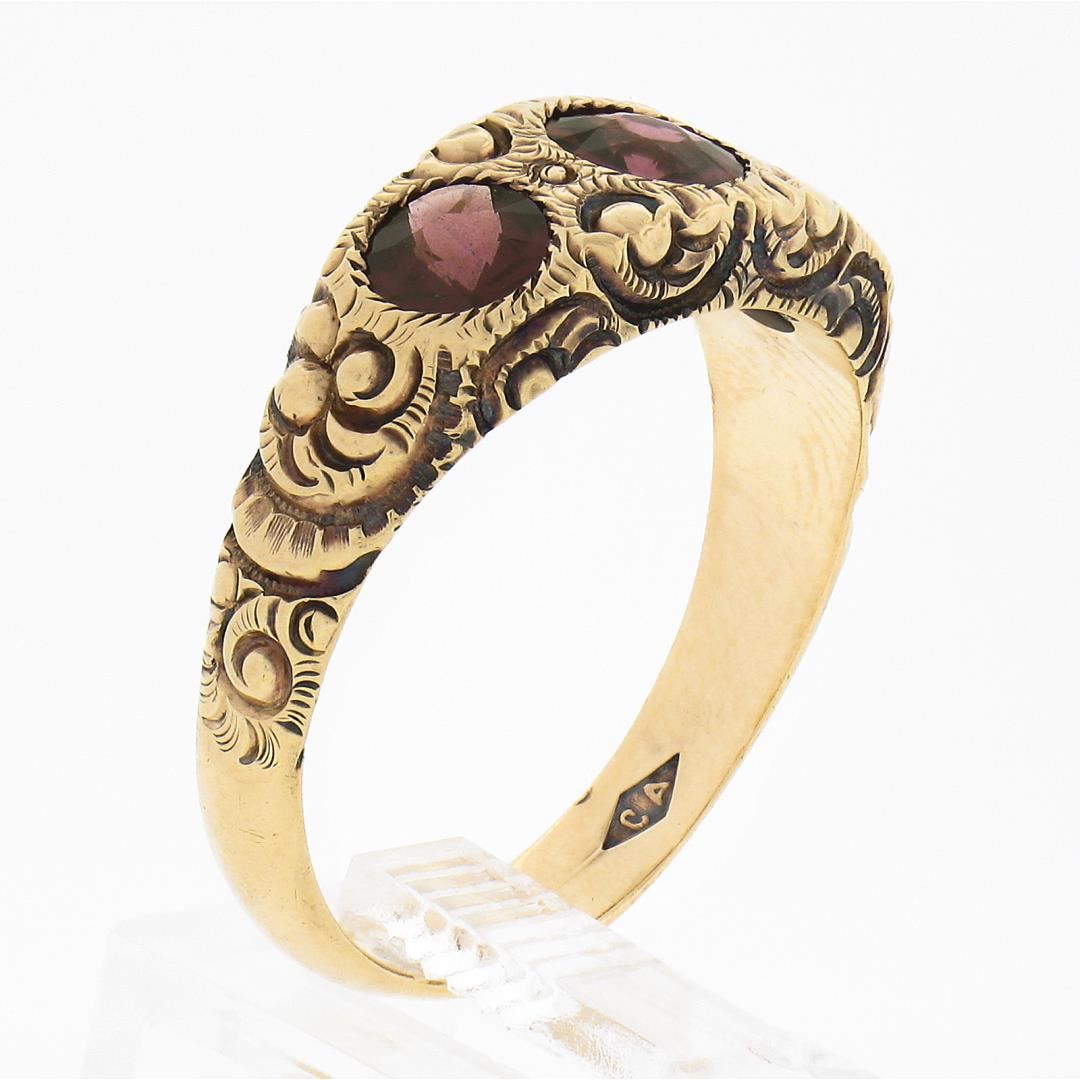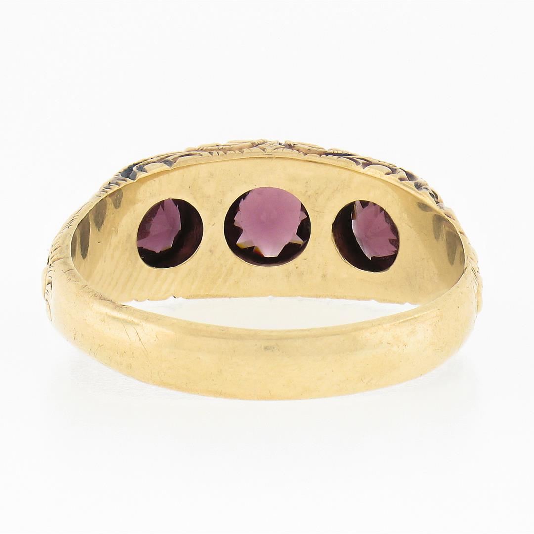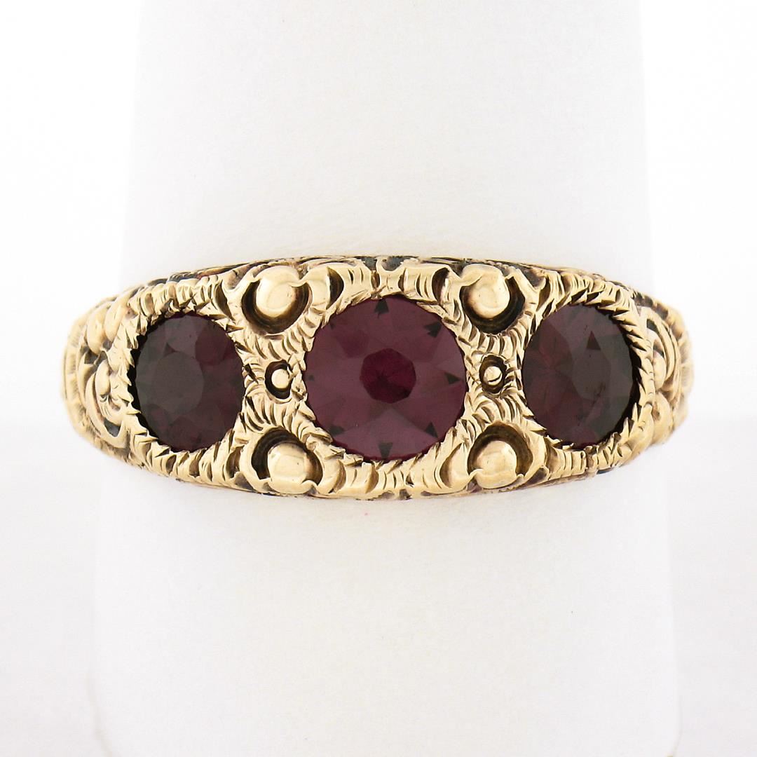 An antique solid 14k yellow gold ring, with 3 old round cut natural rhodolite garnets (1.80ctw). The ring is size 10.5, weighs a total of 6.15 grams, and measures 8.4mm wide.