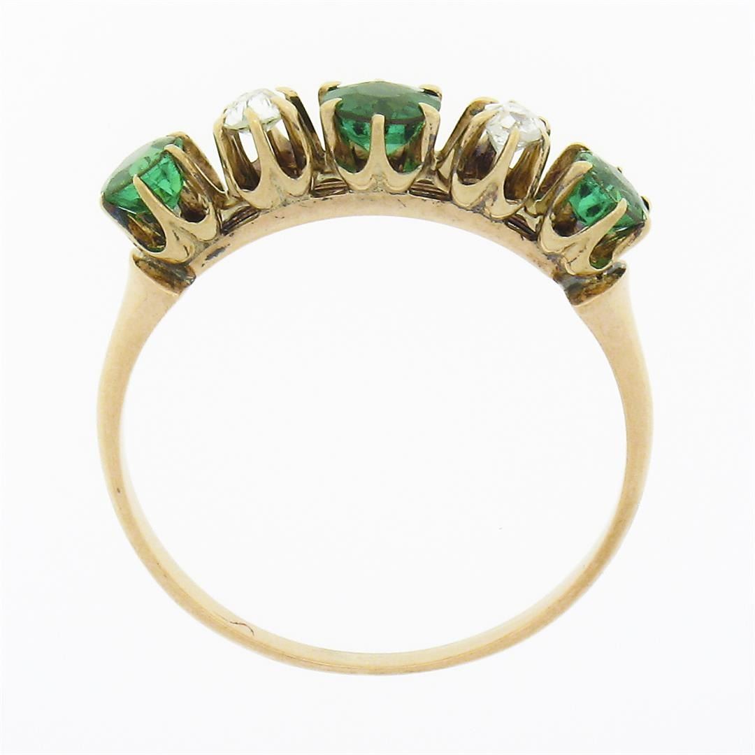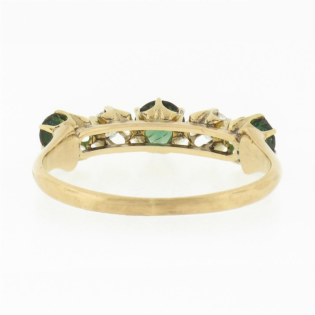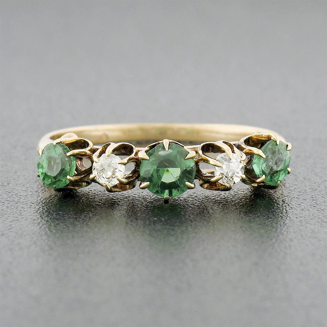 An antique solid 14k yellow gold band ring, with 3 round cut natural tsavorites (0.58ctw), and 2 old mine cut natural diamonds (G/H - SI1/SI2 ; 0.12ctw). The ring is size 6.5, weighs a total of 1.60 grams, and measures 4.55mm wide.