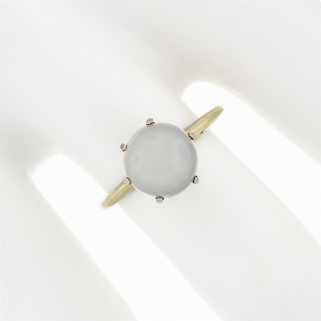 An antique solid 14k yellow gold solitaire ring, with 1 round cabochon cut natural moonstone (8.3mm - 1.98ctw). The ring is size 5.5, weighs a total of 1.72 grams, and measures 8.75mm wide.