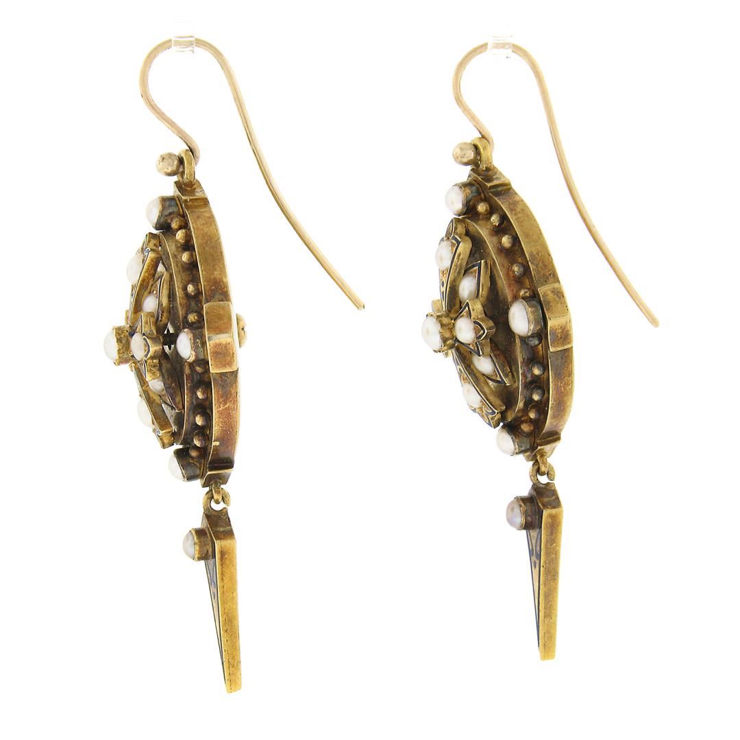 Antique Victorian 14k+ Gold Cultured Pearl Blue Enamel Drop Dangle Earrings